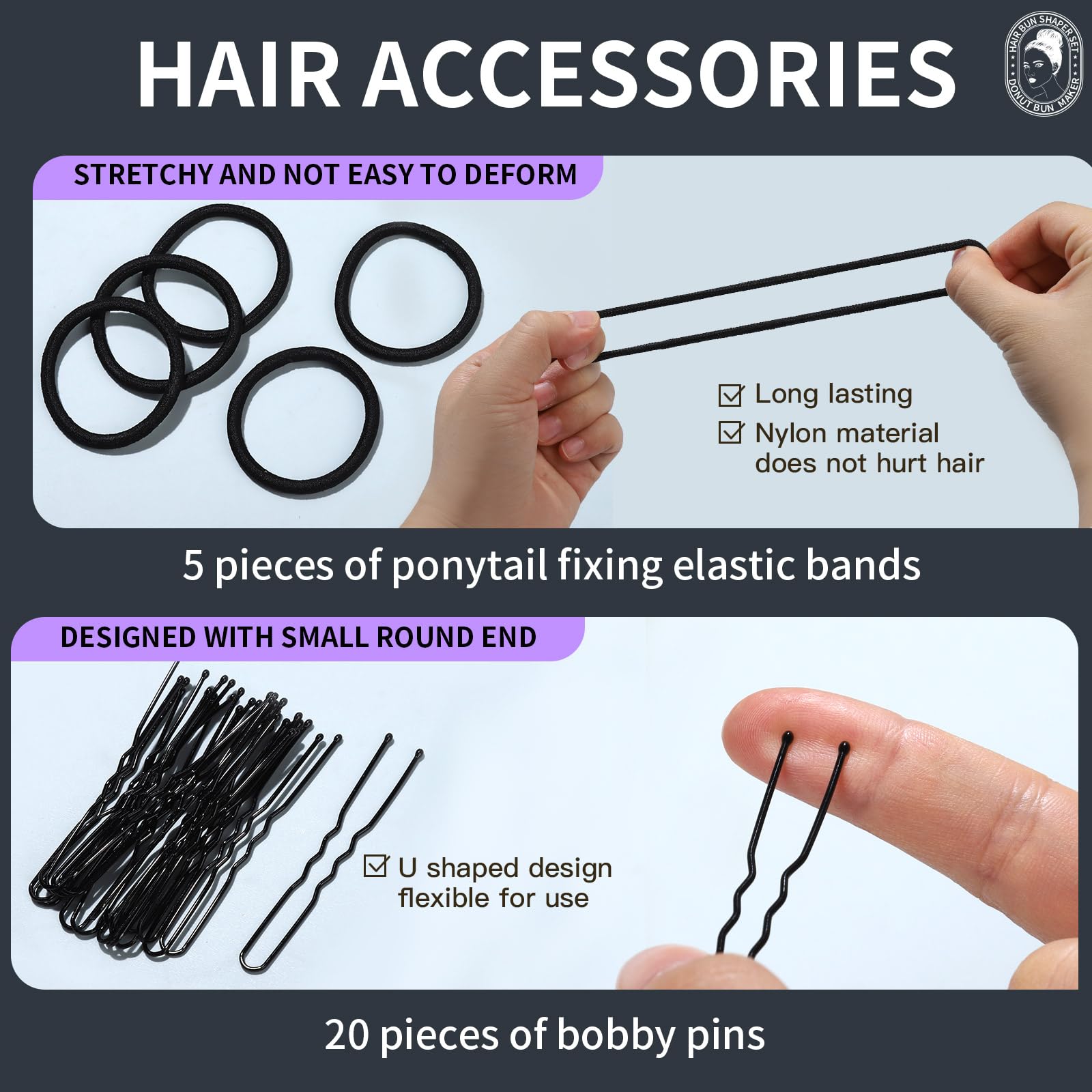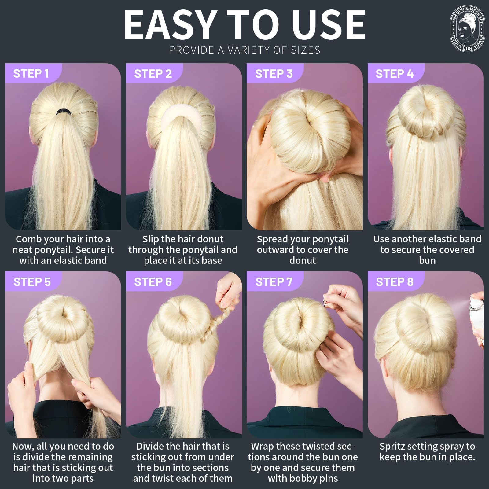 Hair Accessories Set: Our hair bun kit comprises 7 cream-colored hair donut bun makers (1 extra-large, 2 large, 2 medium, and 2 small) to make sure a secure bun all day long. Additionally, it includes 5 elastic bands for styling a chic chignon or ponytail section and securing your hair around the donut. Furthermore, it contains 20 bobbin pins to protect your hair from scratches while offering a firm hold without causing damage