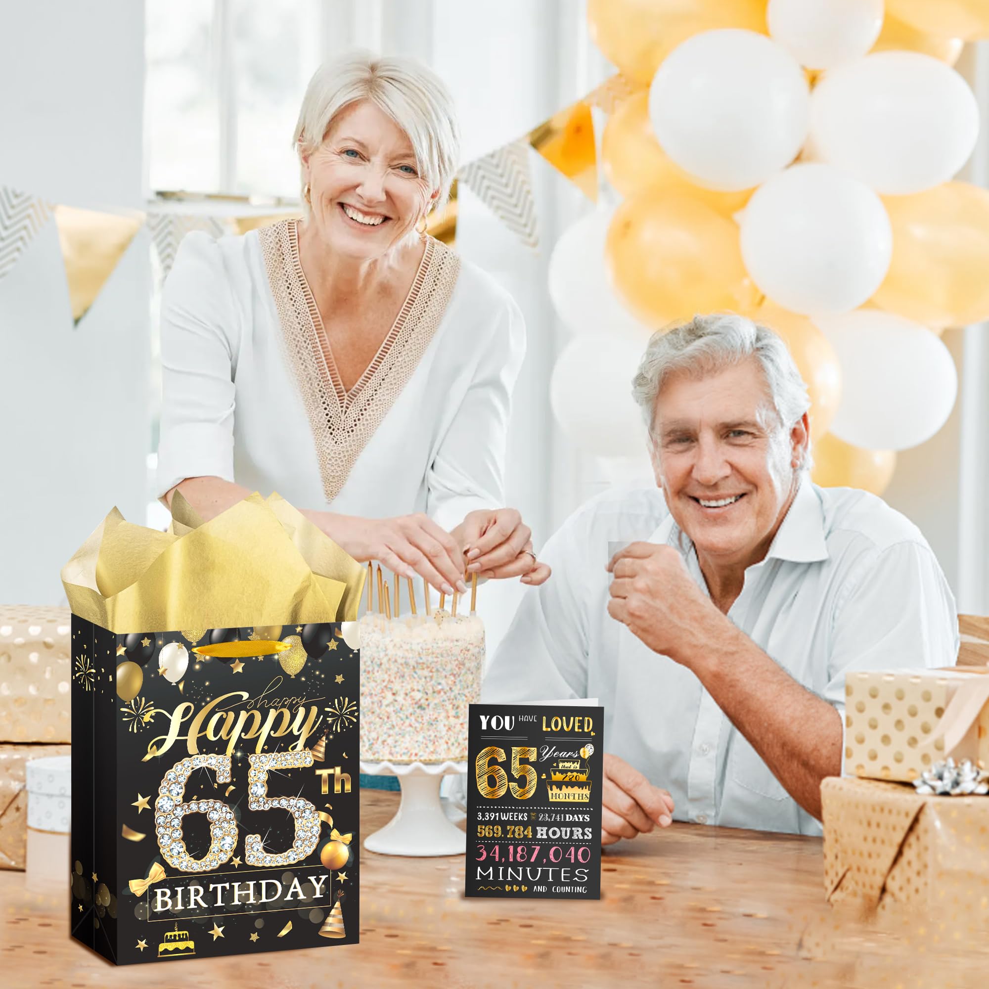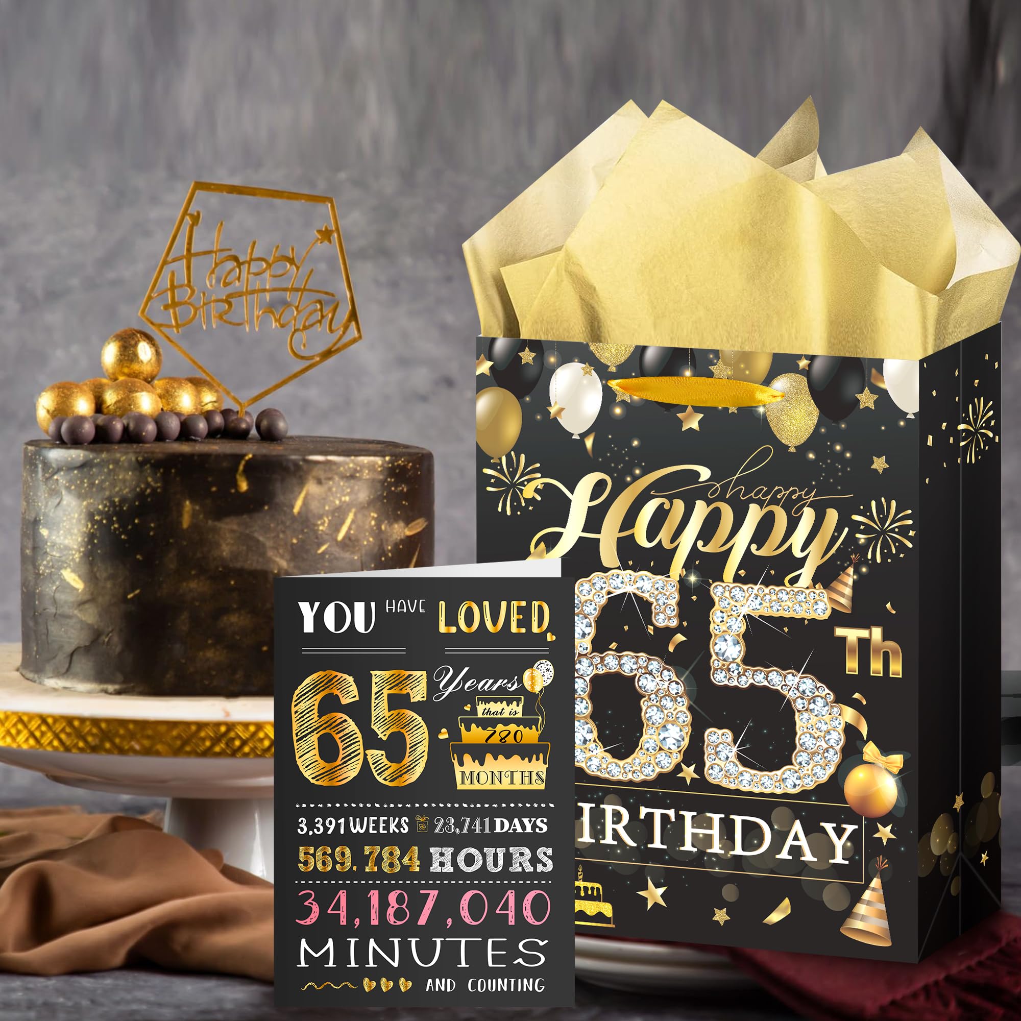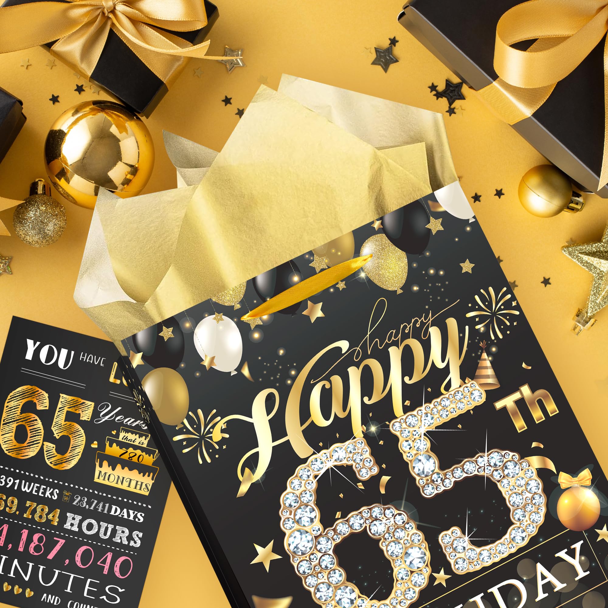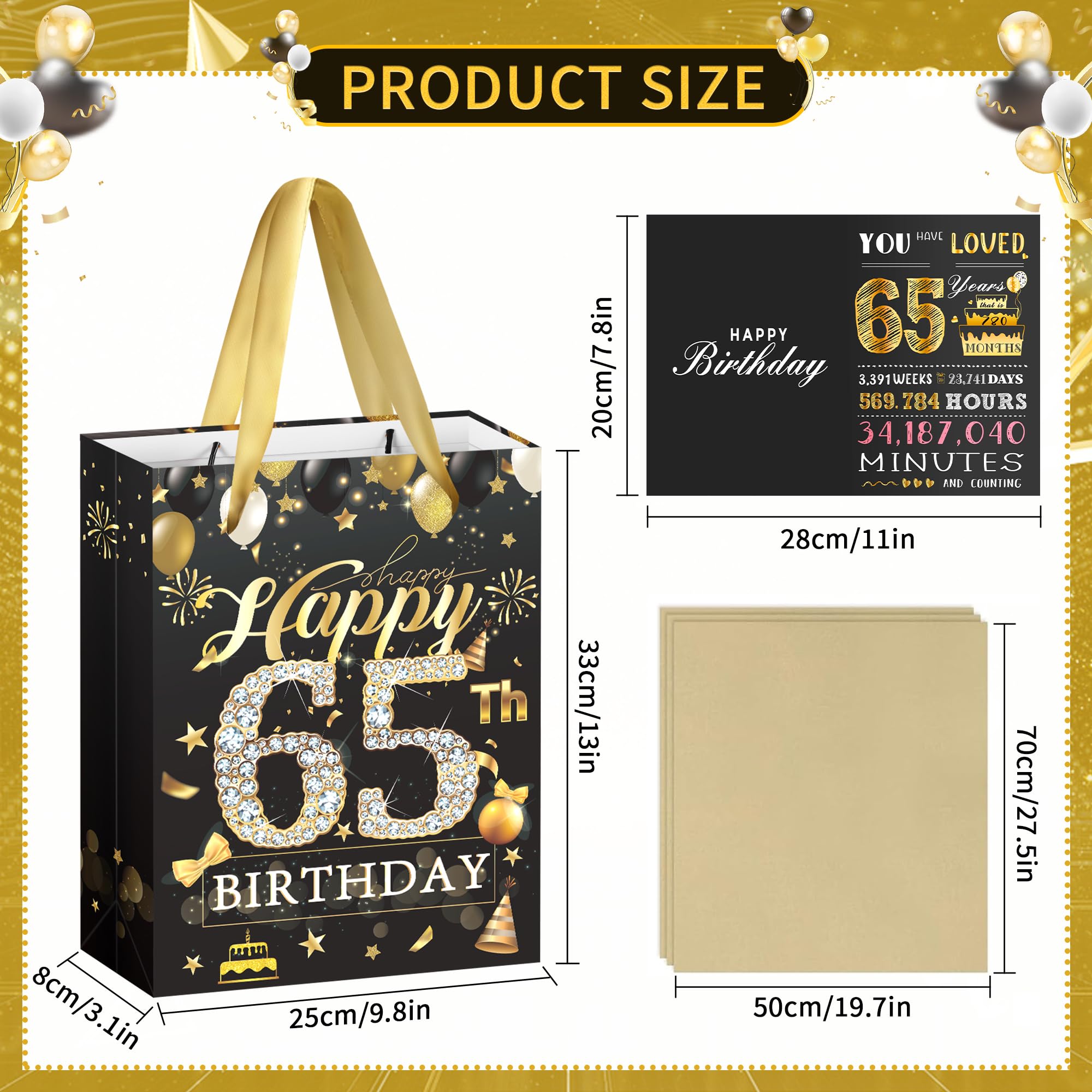 Birthday Gift Bag Set: Our birthday gift bag set includes a 65th happy birthday gift bag, three gold tissue papers and a beautifully designed greeting card, you can write your heartfelt blessings and wishes, making it the perfect accompaniment to any birthday gift