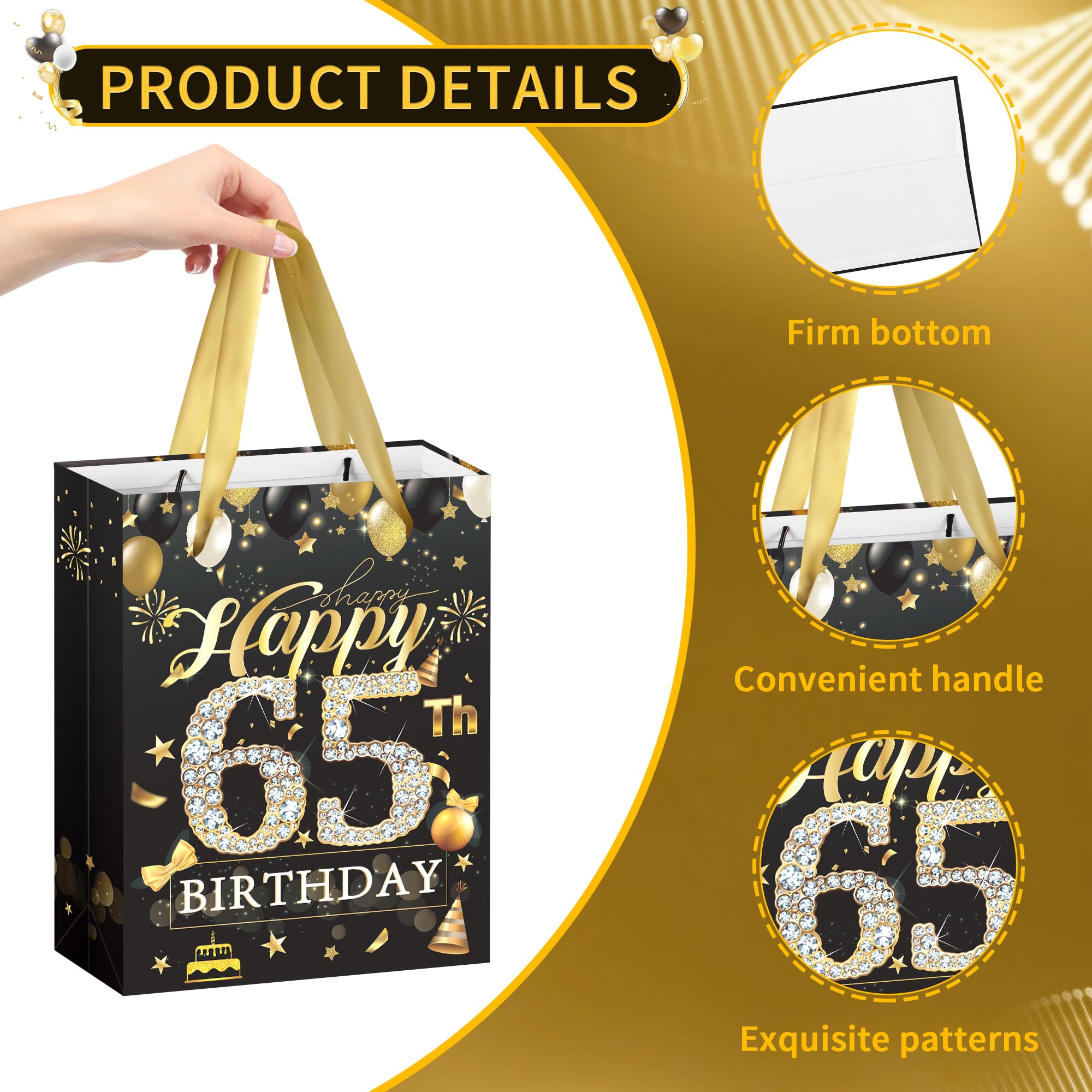 Black Gold Birthday Design: Our birthday gift bag is designed with striking "Happy 65th Birthday" words, balloons, stars, fireworks and other patterns. The classic black and gold color scheme adds a touch of sophistication to any birthday celebration