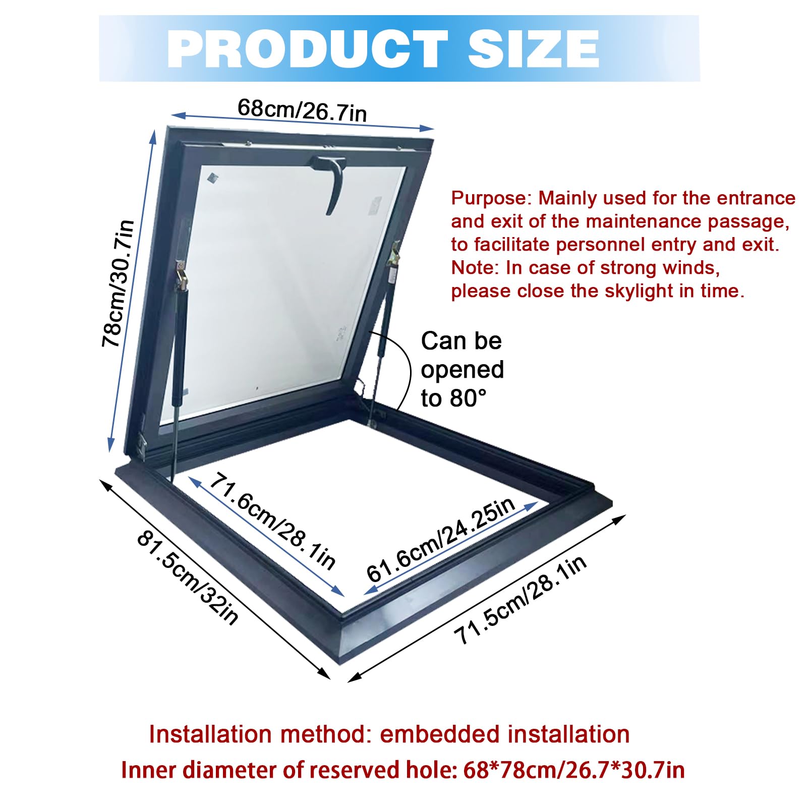 Sturdy and durable: This glass skylight cover is equipped with 2 hydraulic support rods, and the cover can be easily opened or closed. The large opening design is convenient for people to enter and exit. The sealing rubber gasket can effectively prevent rain, dust, debris, etc. from entering the building