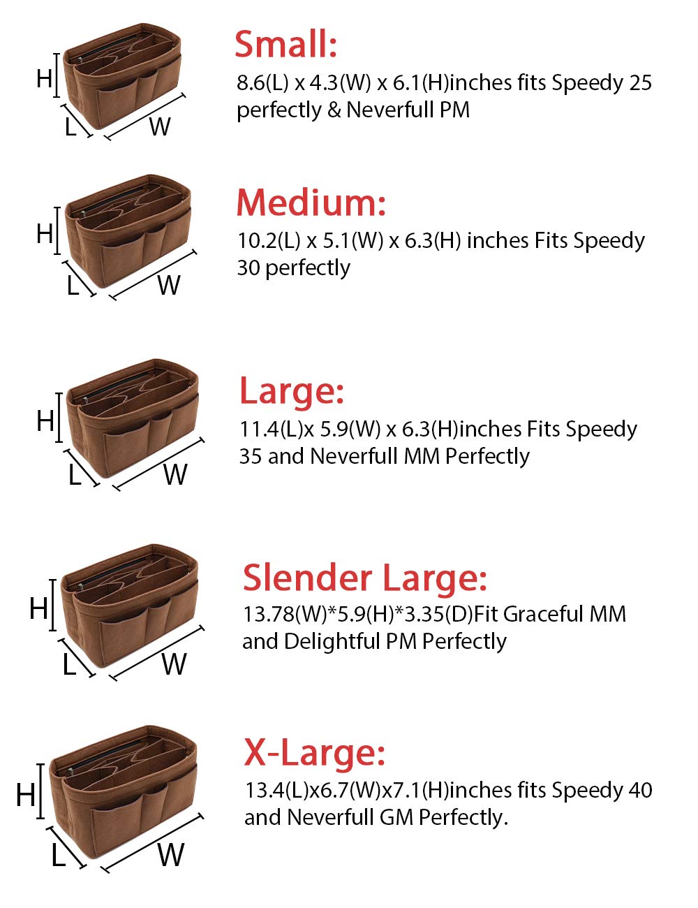 Small:8.6(L) x 4.3(W) x 6.1(H)inches fits LV Speedy 25 perfectly & LV Neverful PM ; Medium: 10.2(L) x 5.1(W) x 6.3(H) inches Fits Speedy 30 perfectly; Large: 11.4(L)x 5.9(W) x 6.3(H)inches Fits LV Speedy 35 and LV Neverful MM Perfectly.X-Large:13.4(L) x6.7(W)x7.1(H)inches fits LV Speedy 40 and LV Neverful GM Perfectly.Portable and Compact Purse Perfectly For any Brand, Such As LV, Longchamp Le Pliage Tote, MK, LV Petit Noe, Gucci, etc.