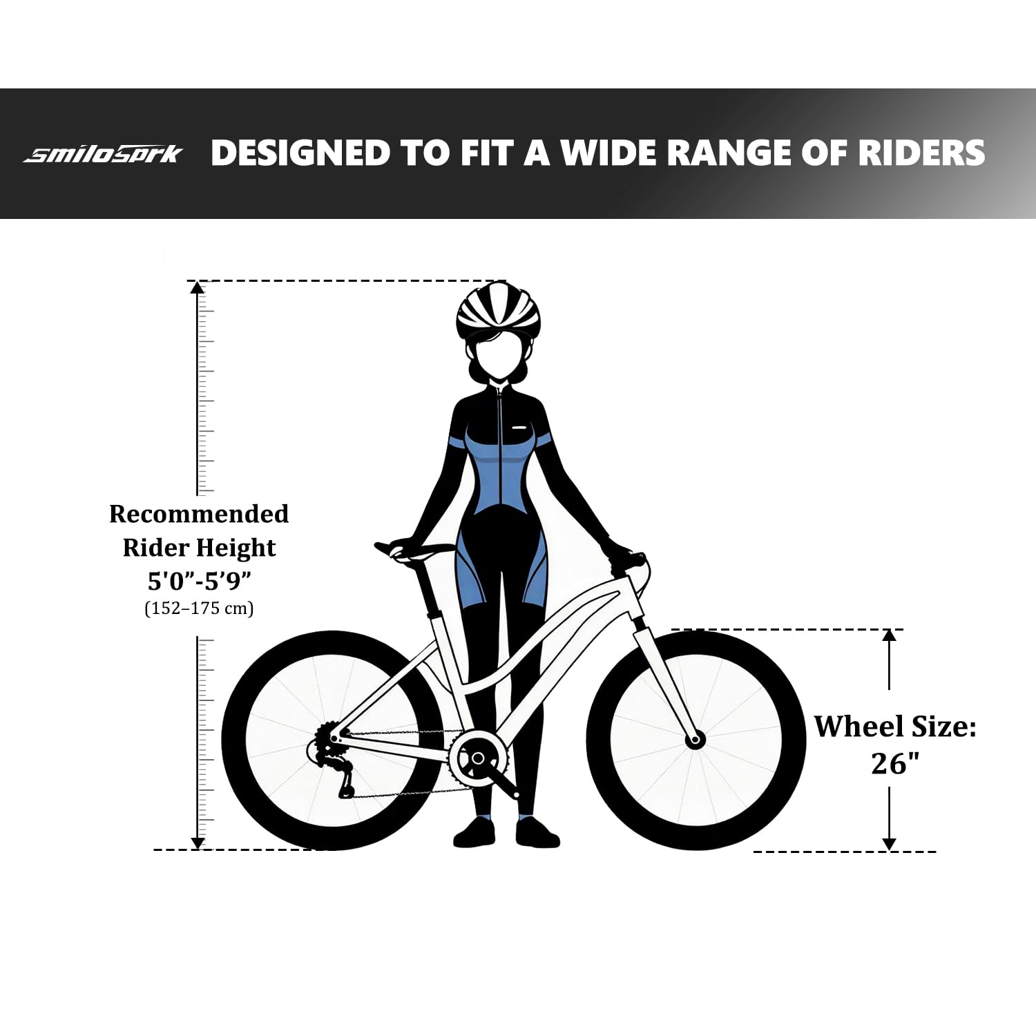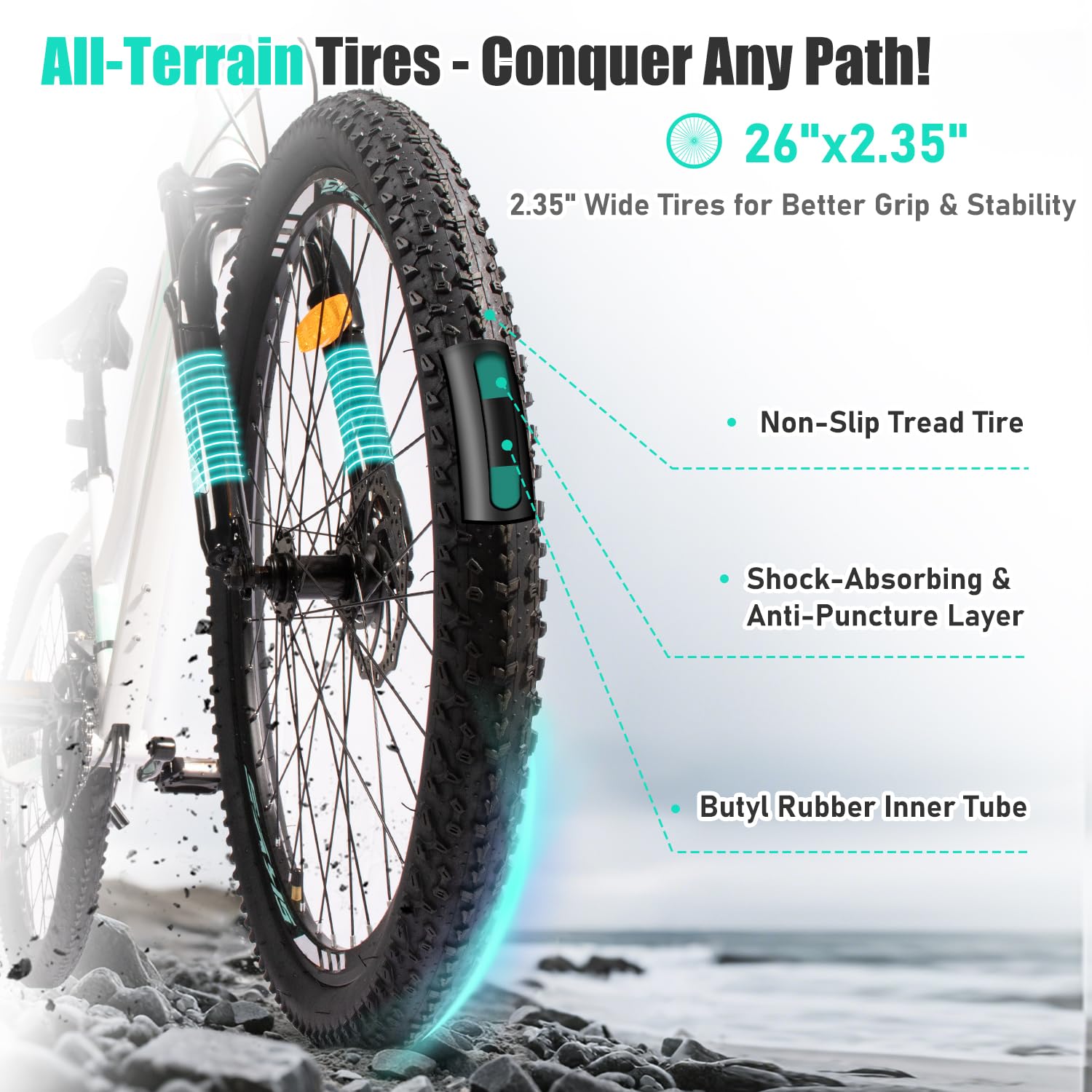【All-Terrain Tires】SmiloSprk mountain bicycle is equipped with 26x2.35 All-Terrain Tires, offering superior grip and stability, perfect for city streets, dirt paths, mountain trails, and more. Conquer various terrains with ease, meeting all riding needs.