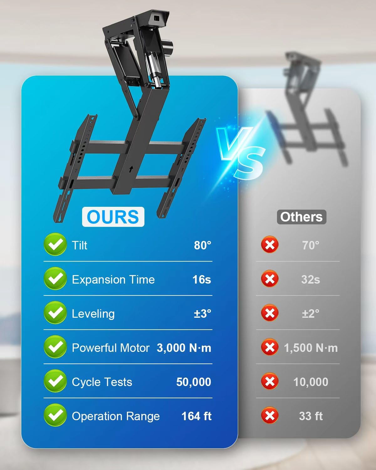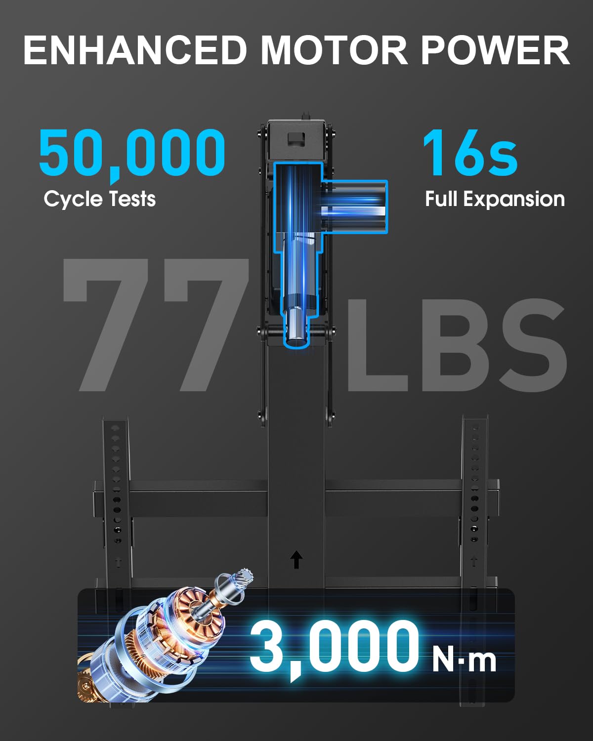 Powerful Motor for Effortless Motion: Experience smooth, quiet performance with a high-torque 3,000 N·m motor that expands fully in just 16 seconds. This electric ceiling TV mount combines speed and precision with ±3° screen leveling. Engineered for durability and reliability, it has passed 50,000 cycle tests—making it the most dependable drop down TV mount for long-term everyday use.