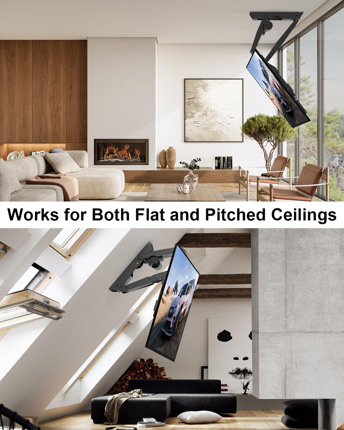 Elevate Your Entertainment Experience: Upgrade your setup with this premium motorized ceiling TV mount, built to impress in both performance and style. Supporting 23–55 inch flat or curved TVs up to 77 lbs, this ceiling mount TV bracket smoothly flips 0°–80°. Designed for flat and pitched ceilings, it’s the perfect electric adjustable flip down TV mount for a clean, modern home or office look.