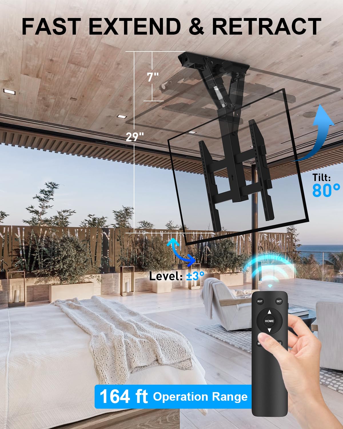 Built to Last with Unmatched Stability: Crafted from premium heavy-duty steel, this full motion ceiling TV mount securely supports TVs up to 77 lbs. The reinforced structure and steady motor movement ensure long-term stability without sagging or shaking. Perfect for both indoor and covered outdoor setups, this electric ceiling TV mount guarantees peace of mind and flawless performance.