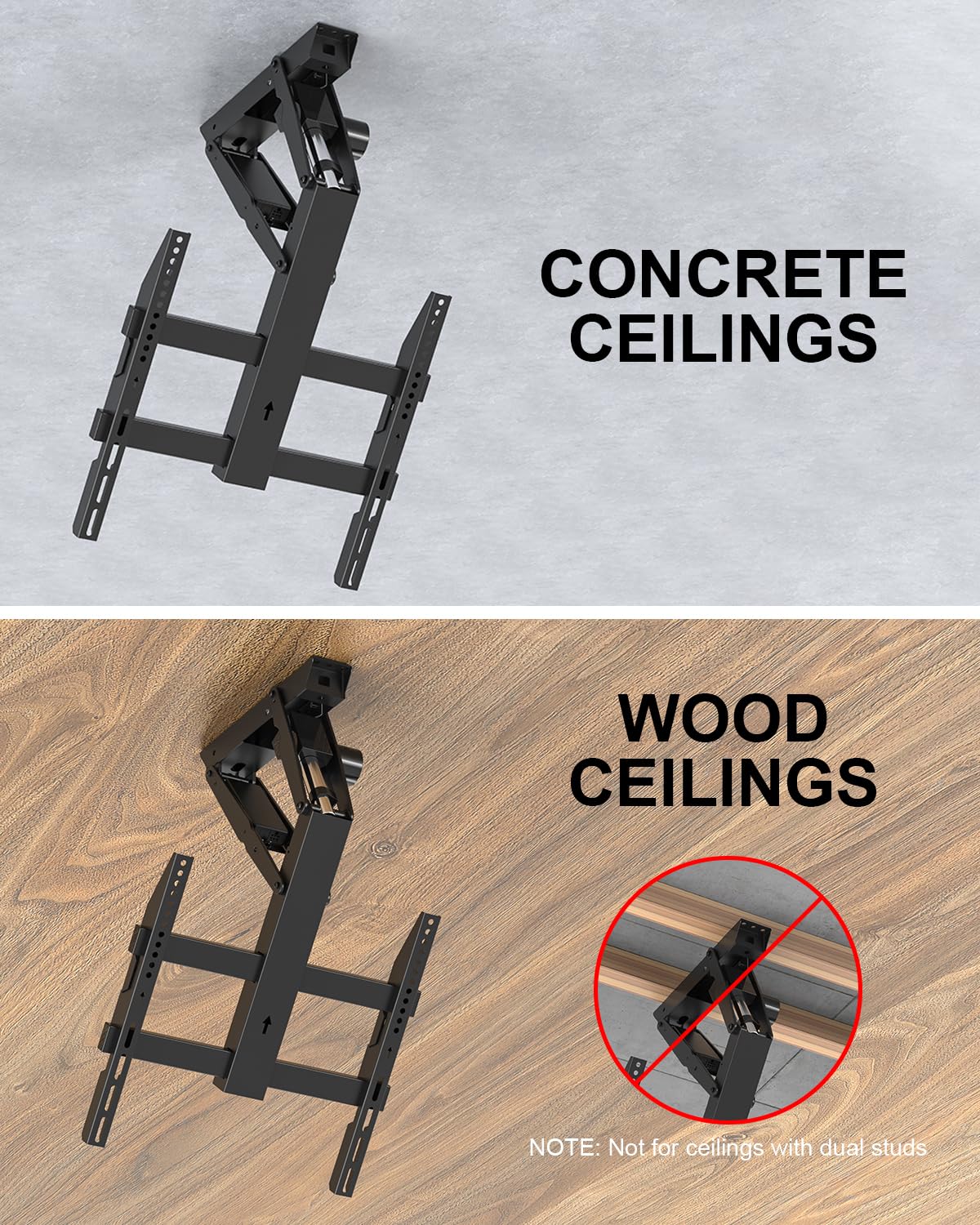Easy Installation, Universal Fit: Compatible with 23–55 inch TVs and VESA 100x100mm to 400x400mm, this ceiling mount TV bracket fits most popular brands. All hardware and step-by-step instructions are included for wood or concrete ceilings. With its fast setup and smart engineering, this motorized ceiling TV mount brings luxury viewing to any room—effortless, elegant, and secure.