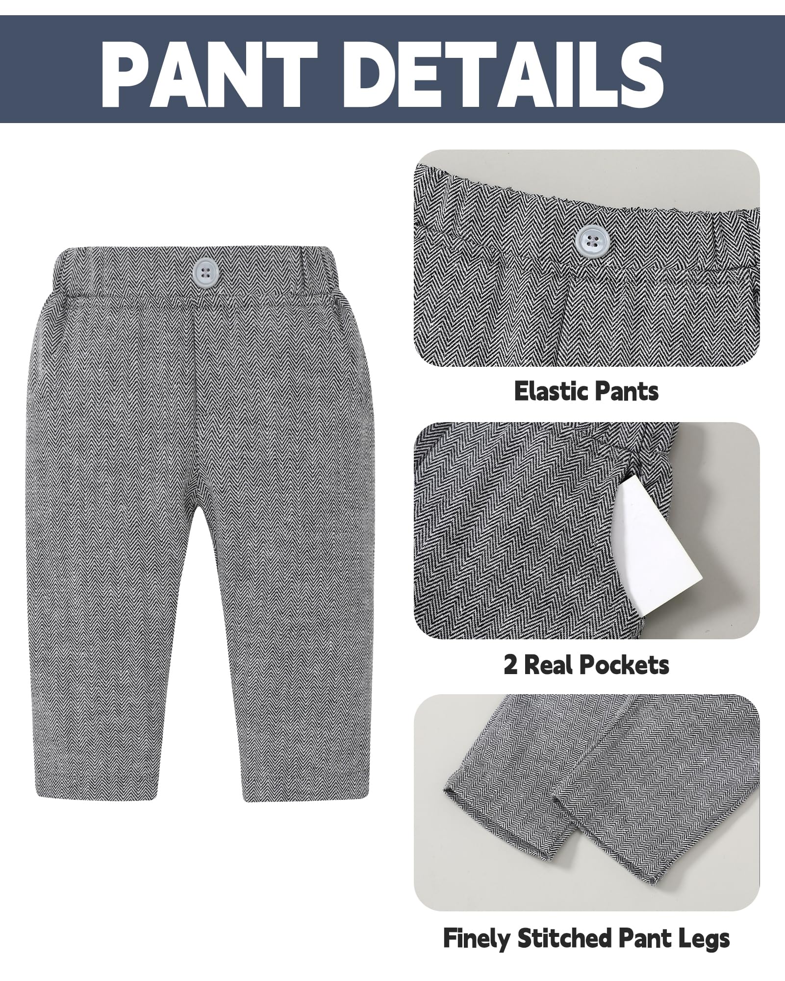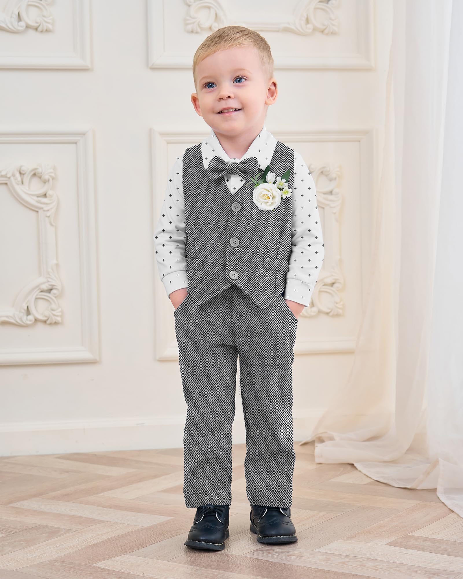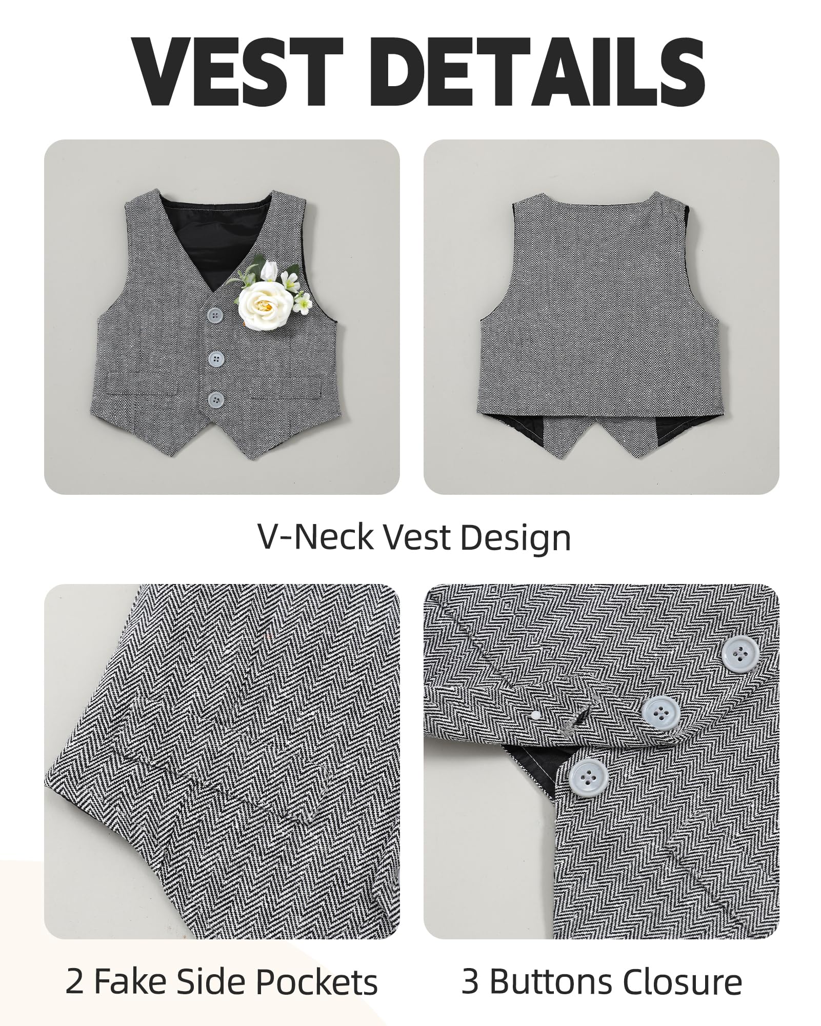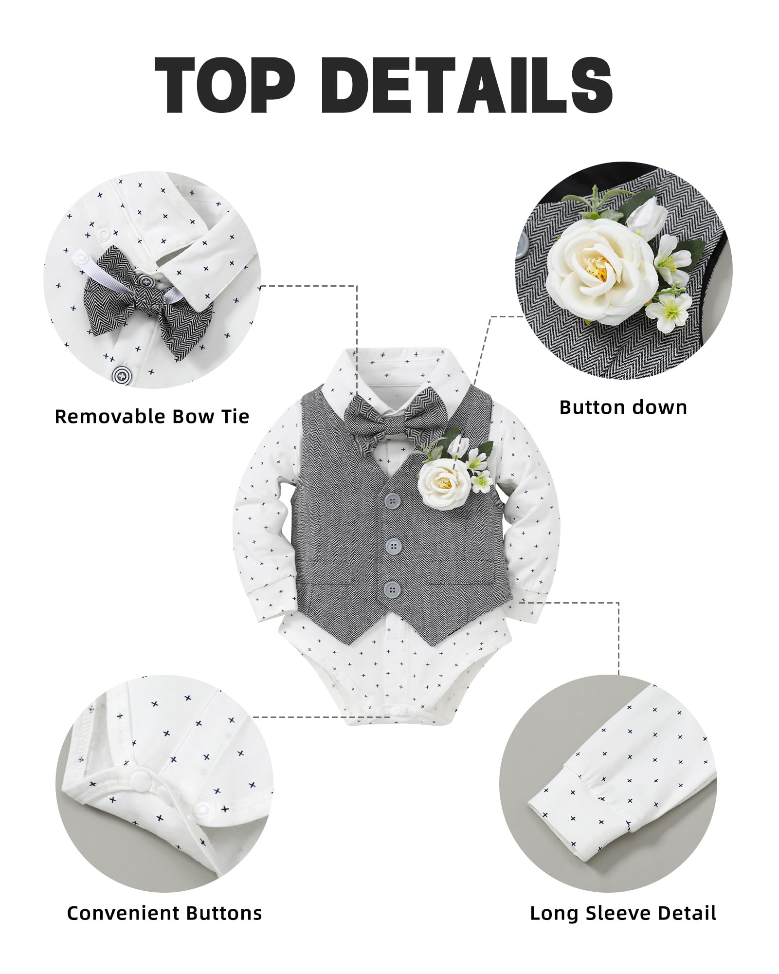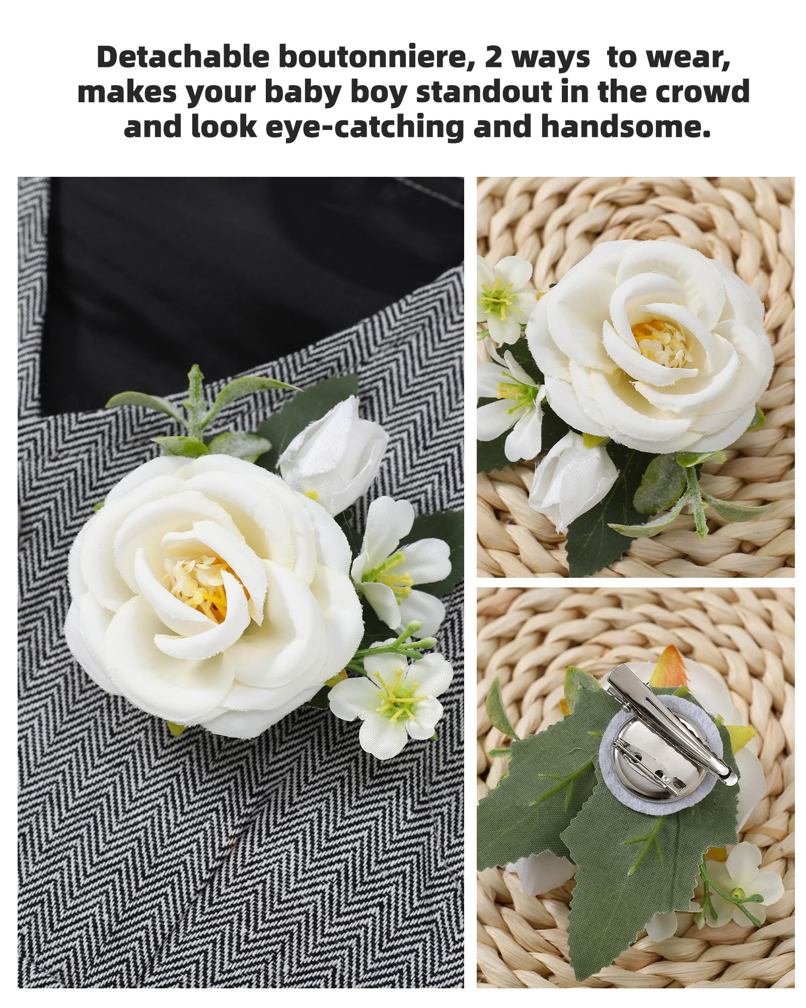 Design: Baby boys formal clothes outfits, the buttons on the bottom of the top are designed to make it easy for the baby to put on and take off. Removable tie and detachable boutonniere design 5pcs baby suit.