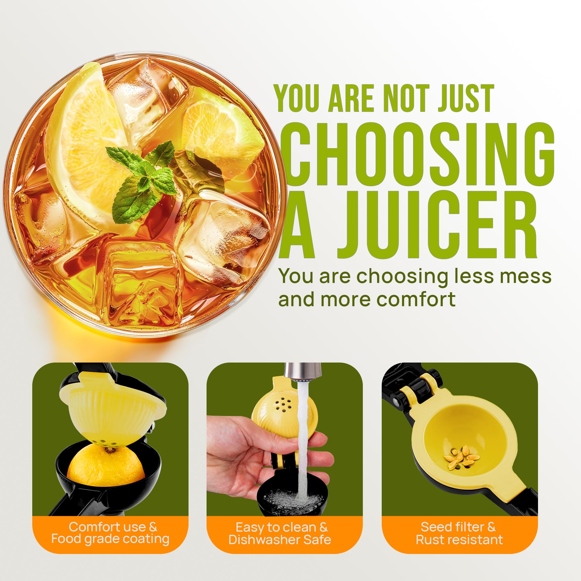 CLEANS IN SECONDS: After adding a tangy flavor to your recipe, simply toss the citrus juicer in the dishwasher for a quick clean up. Our juice press can also be effortlessly cleaned by running it under water.