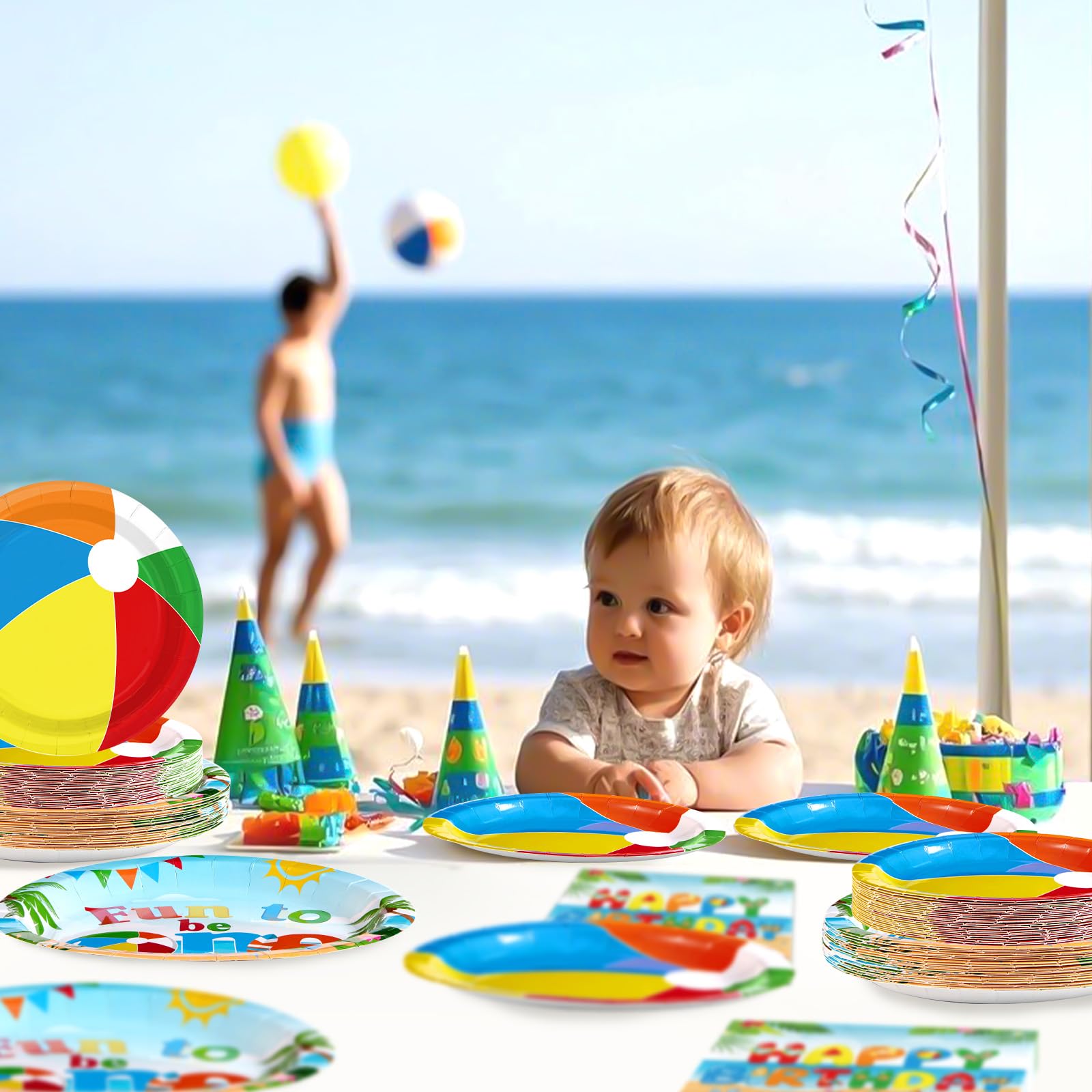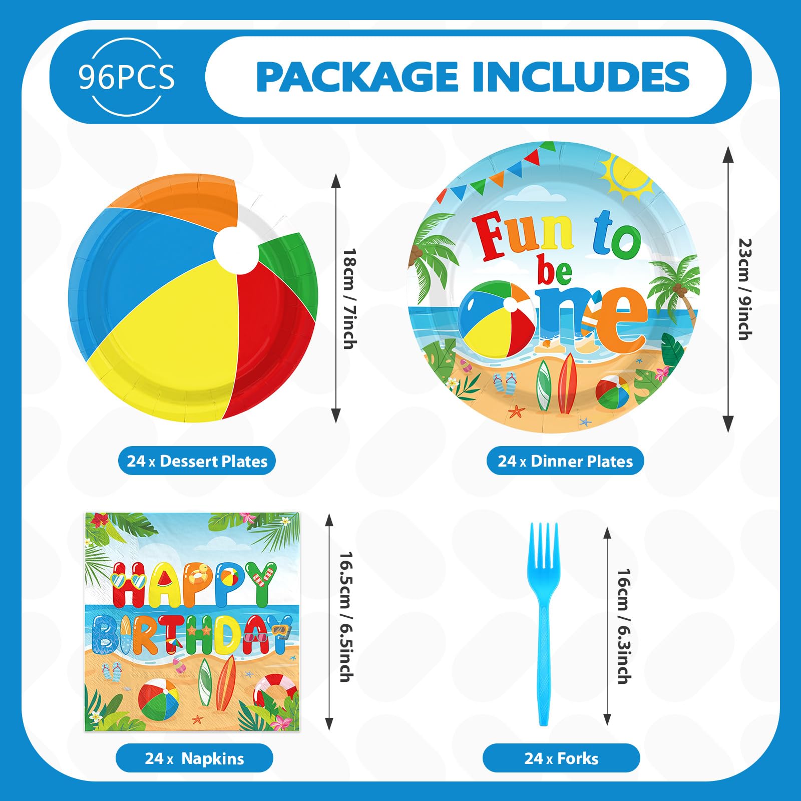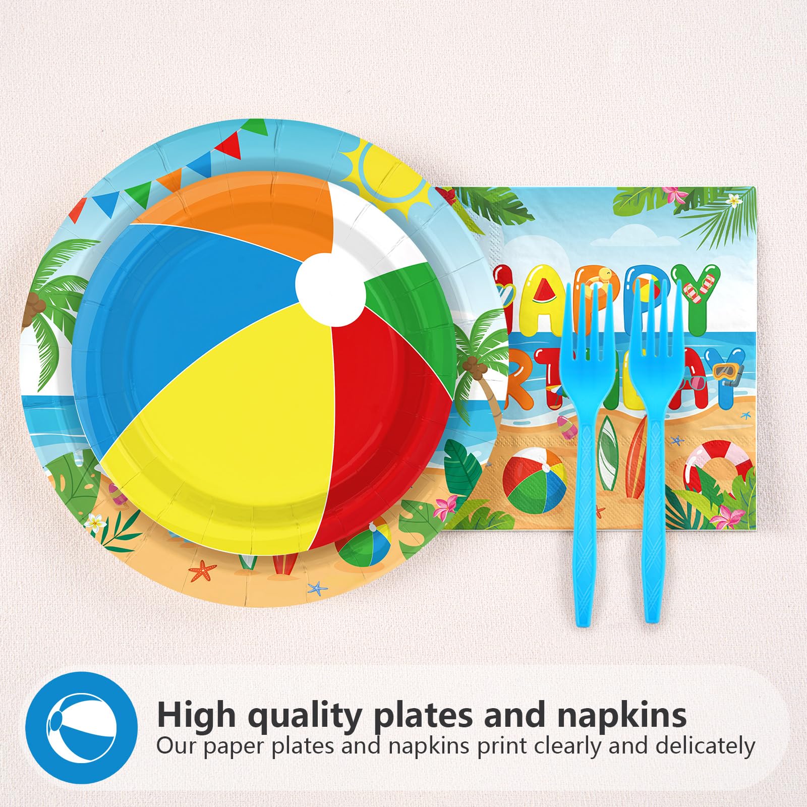 Summer Pool Party Supplies: Get ready for your summer 1st birthday party with the cute summer beach ball plates and napkins sets! The 96-piece tableware includes 24 9-inch plates, 24 7-inch plates, 24 napkins and 24 forks, capable of serving up to 24 guests in style for both your everyday dining and table decorating needs