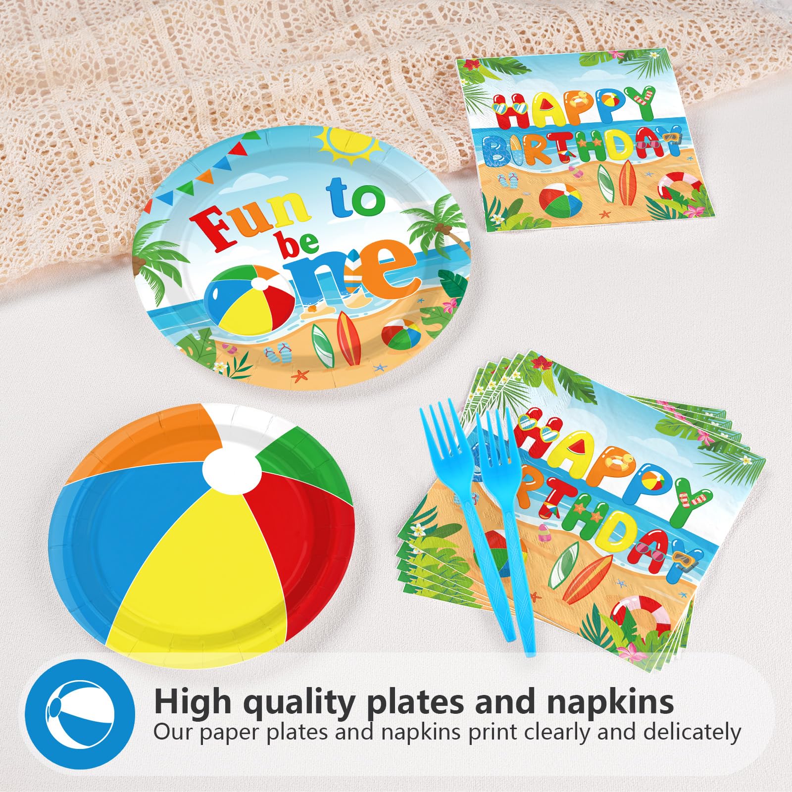 Fun to Be One birthday Decorations: The set of summer beach party tableware is the perfect addition to your baby shower 1st birthday party decorations. They coordinate perfectly with your other summer 1st birthday party decorations, such as summer 1st birthday party tablecloth, summer 1st birthday party banner, summer 1st birthday party backdrops. The happy summer pool 1st birthday party decorations is perfect for setting the atmosphere of your event, they will add joy, love and laughter to your party scene, making it unforgettable