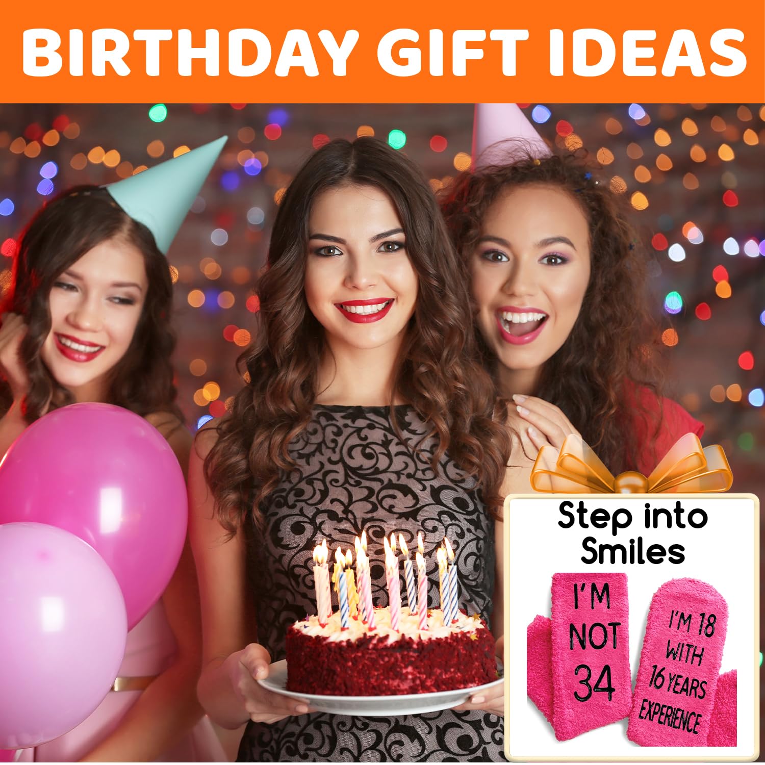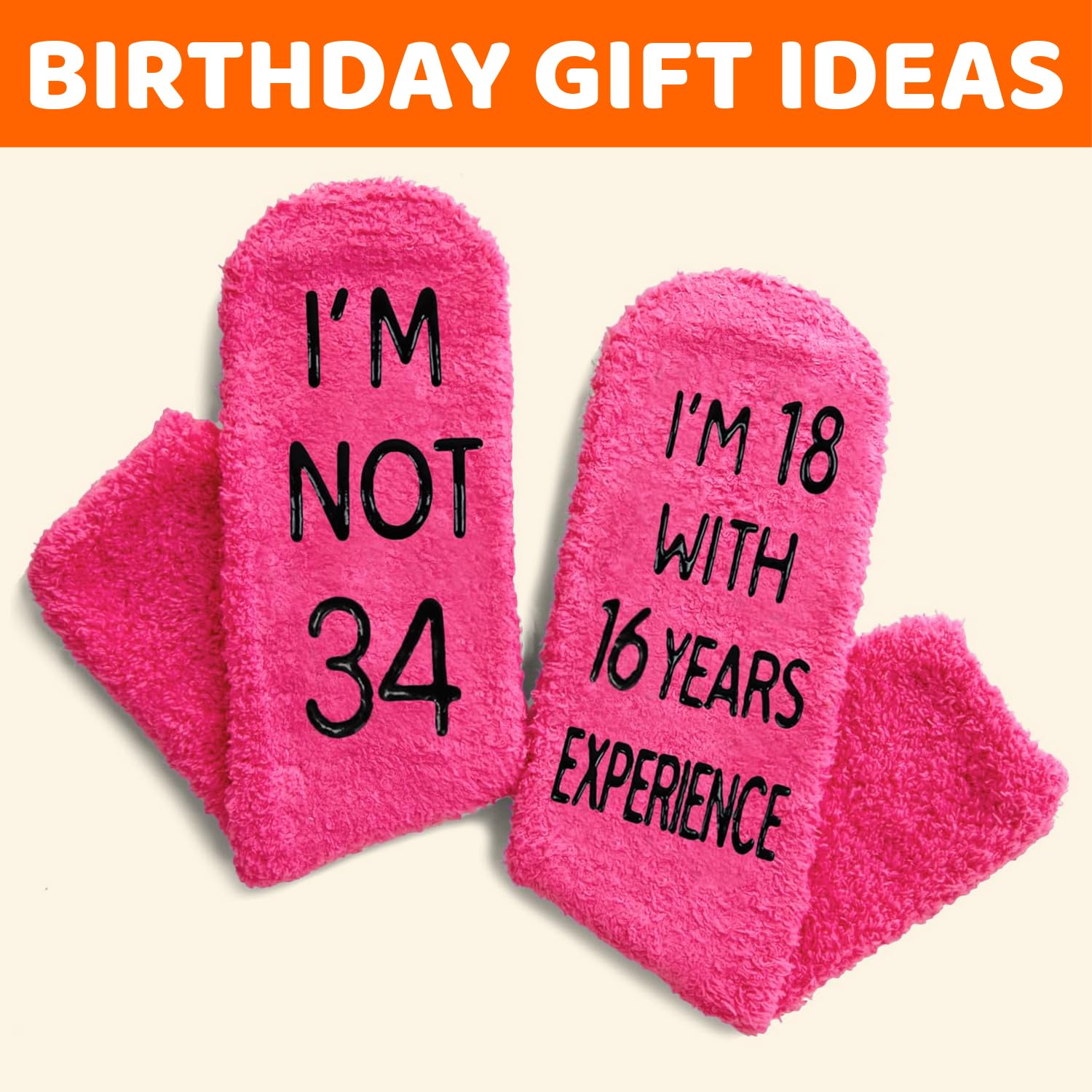 34TH BIRTHDAY GIFT IDEAS: Celebrate with our "I'M NOT 34, I'M 18 WITH 16 YEARS EXPERIENCE" socks, good for any occasion. They are ideal for Birthday presents, Christmas surprises, or playful White Elephant gifts.