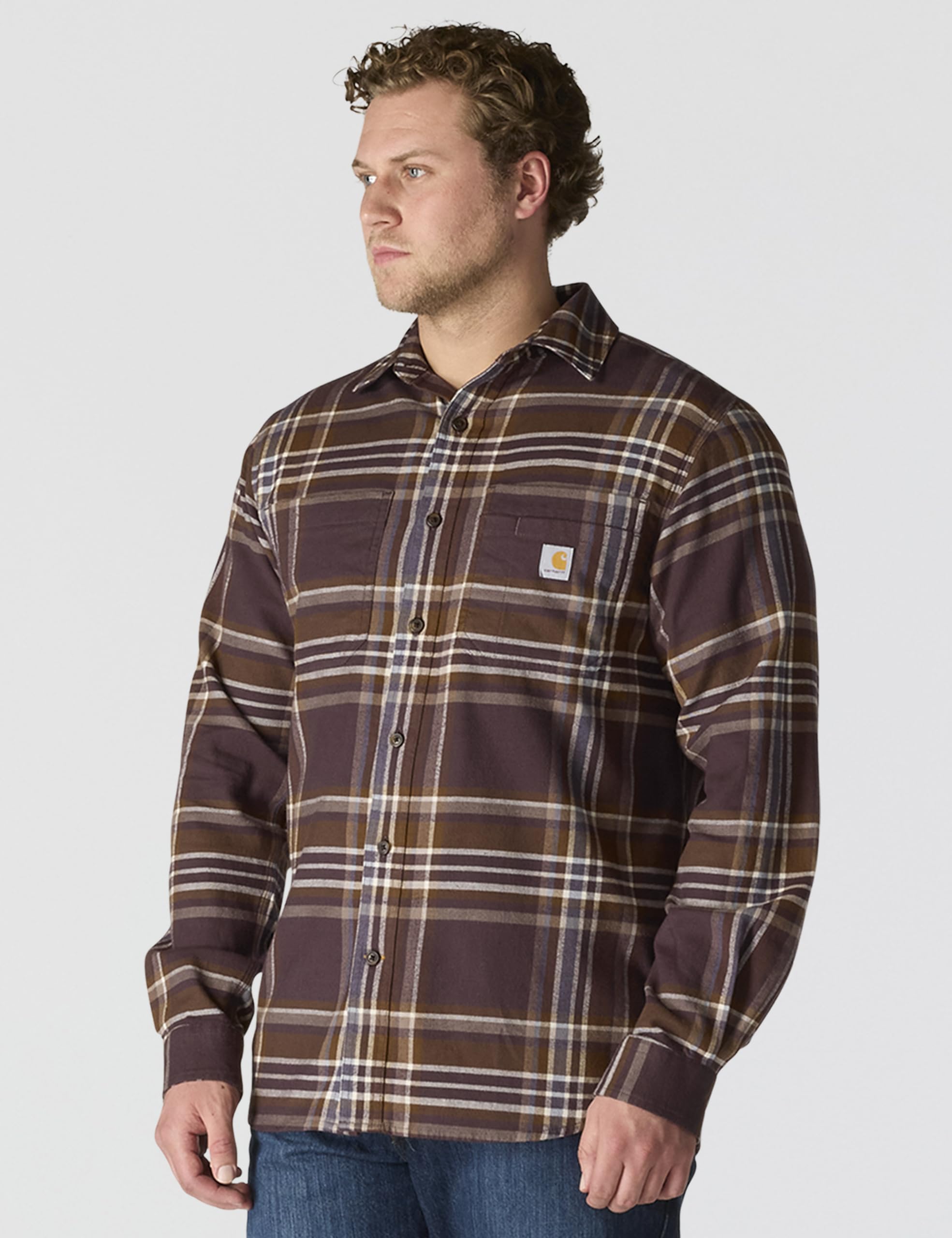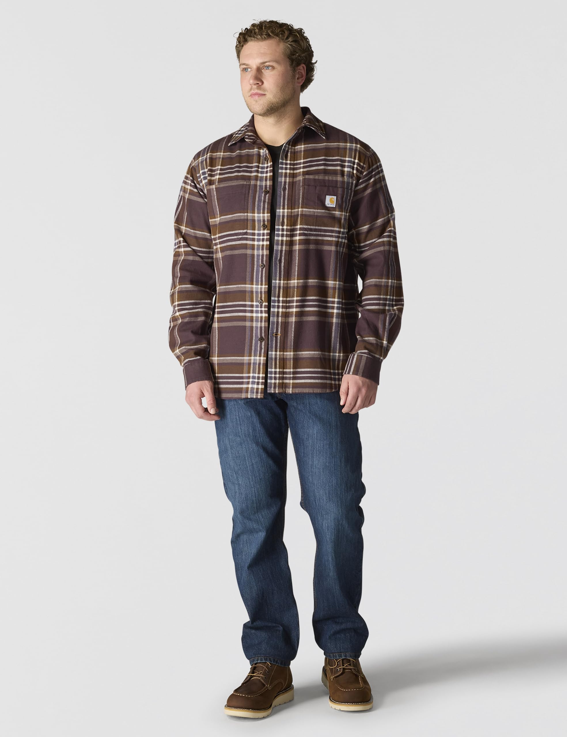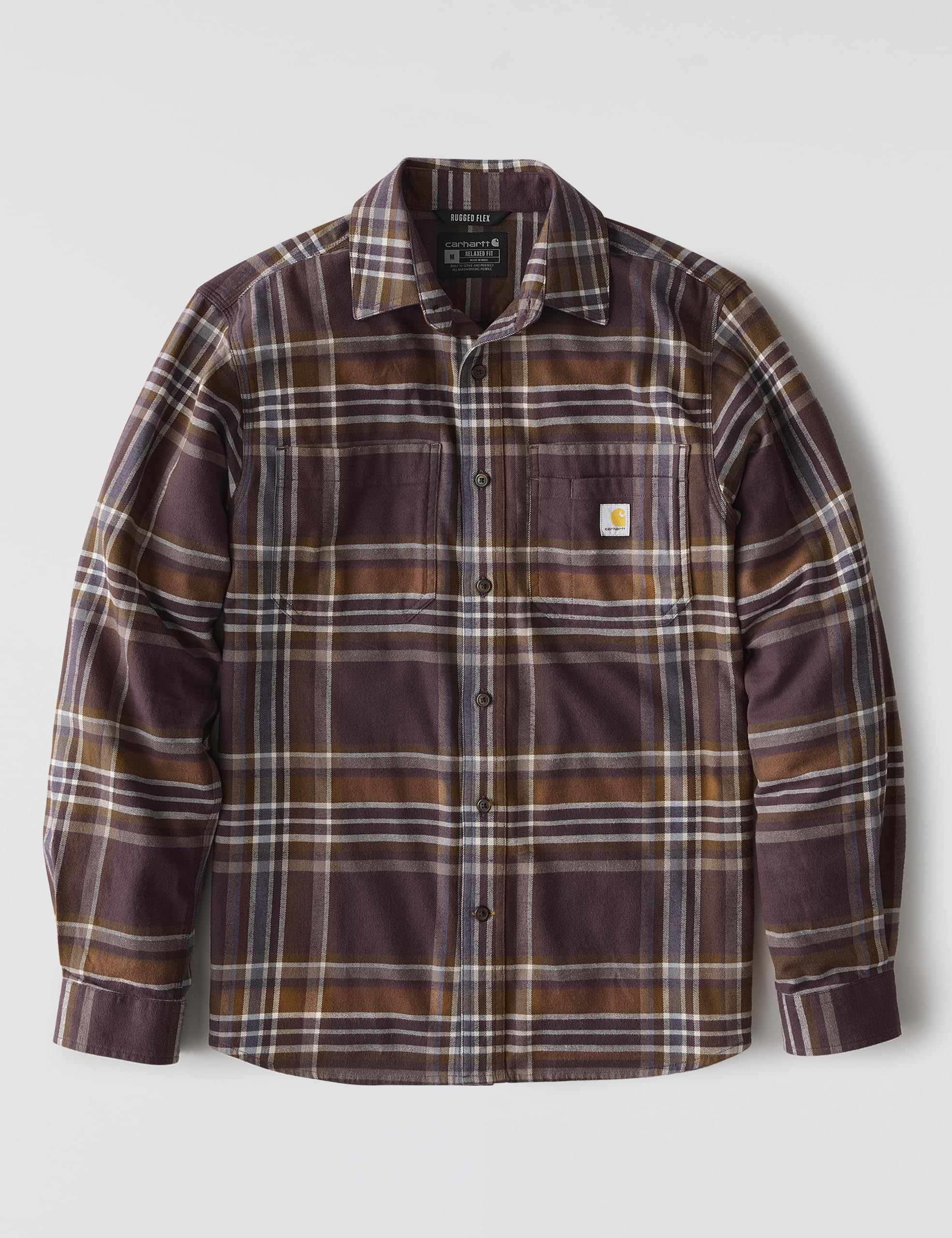 Description Made to be worn tucked or untucked, this men's Carhartt flannel shirt features a midweight cotton blend with just the right amount of stretch for an unrestricted range of motion. A loose fit allows for easy layering and a natural range of motion.