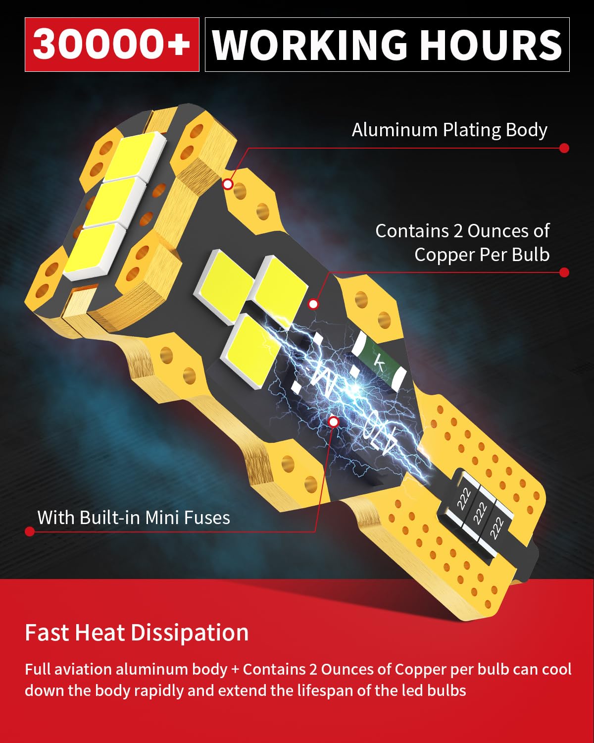 【Safe Driving】Loaded with mini fuses to prevent 912 led bulb from burning out by the excessive instant current to ensure safer installation. Efficient heat dissipation make sure the T15 led bulb will work 30,000 hours. 3 Luminous Points Design, with similar beam pattern to halogen to provide safe driving.