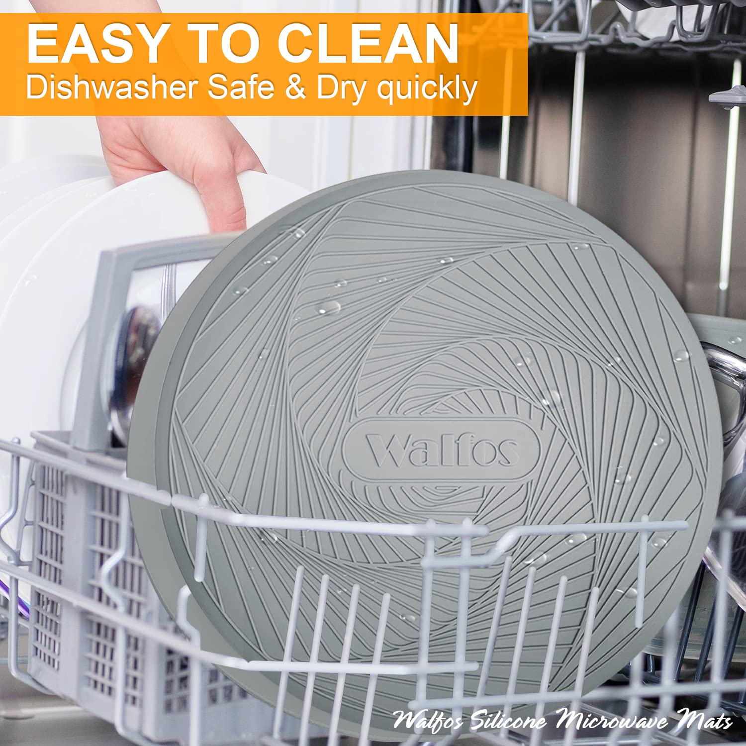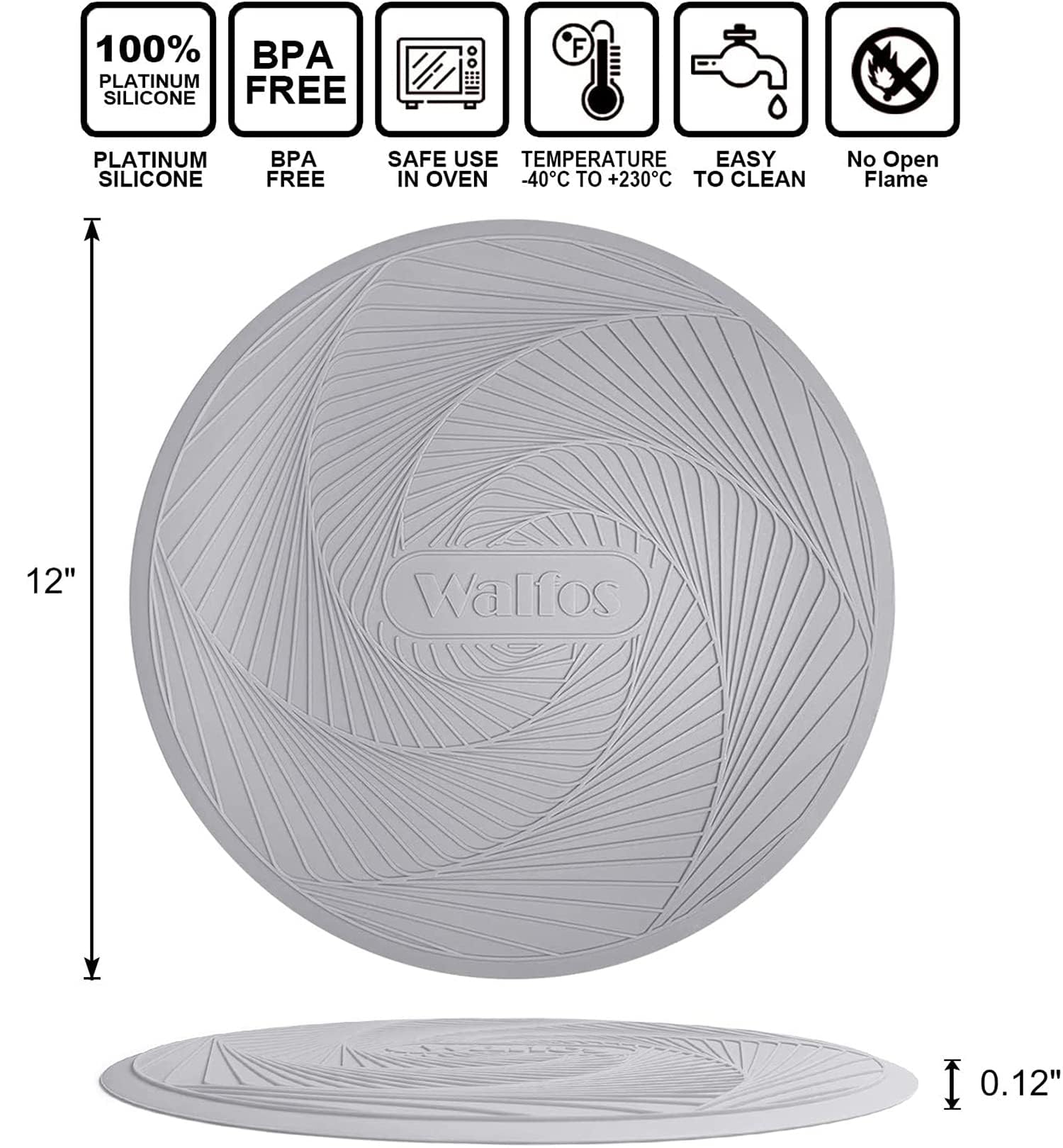MULTIPURPOSE SILICONE MAT: Walfos Microwave Mat perfect for using as microwave cover for food, trivets for hot pots and pans, hot pads for kitchen, silicone pot holders, drying mat, utensils rest, place mat, jar opener, etc. Package Includes: Two 12 Inch Round Silicone Mat