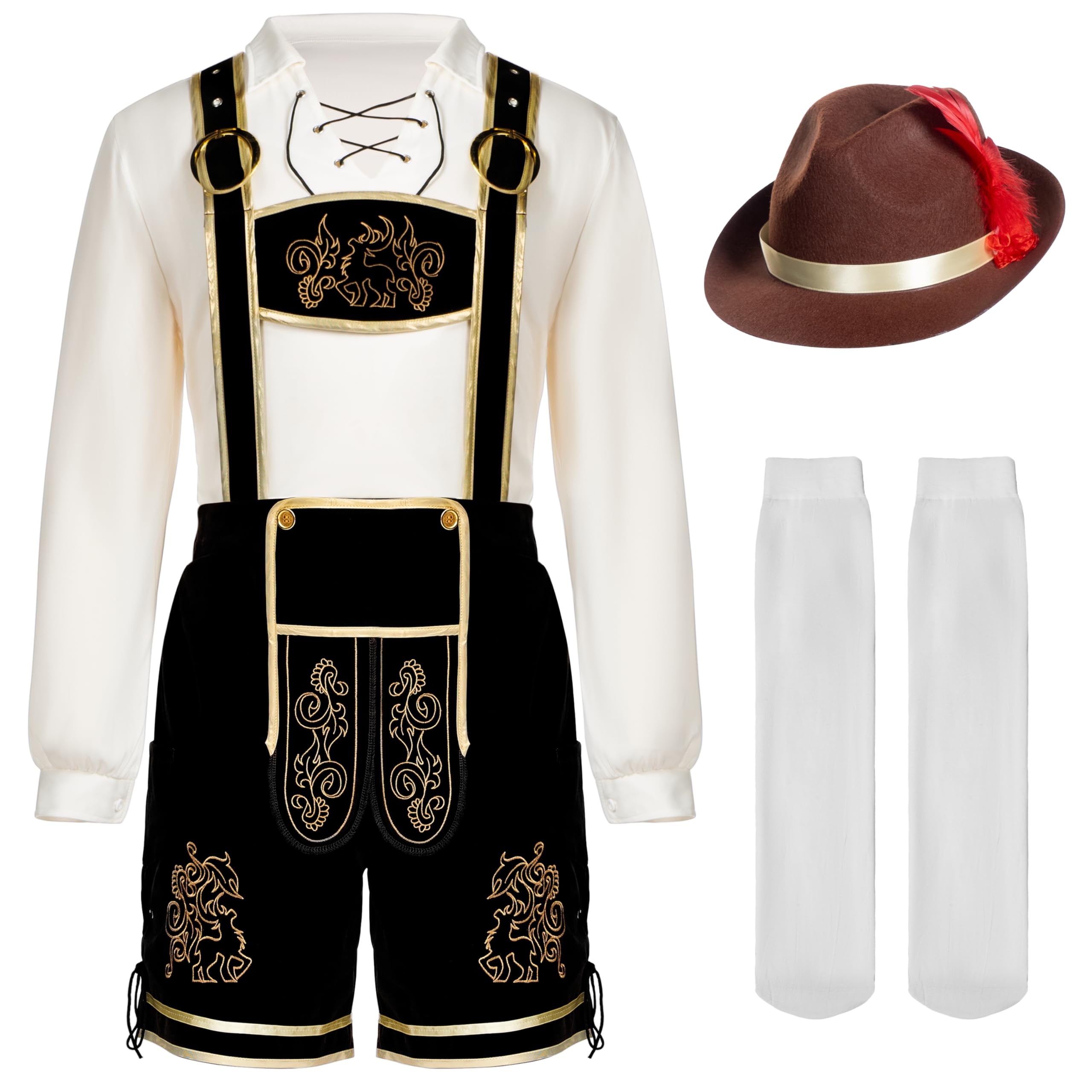 Menβs Bavarian Octoberfest Lederhosen Costume, includes Traditional Embroidered German Design Oktoberfest Pants Outfit w/ Suspenders and Detachable Bib, Pullover Shirt w/ Lace-up Collar, a Pair of Knee Socks, and German Alpine Hat (Beer stein not included)