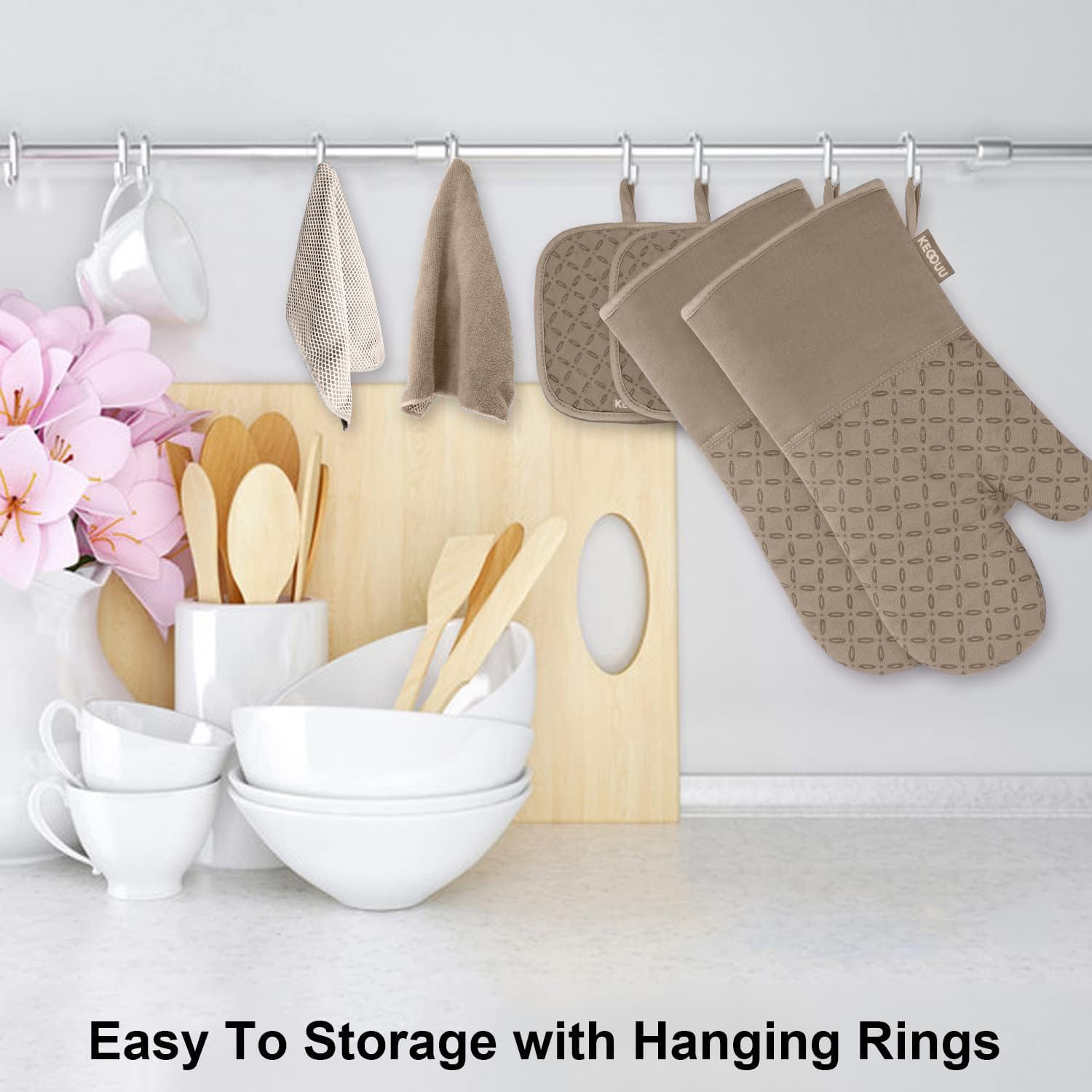 EASY TO STORE: The kitchen oven mitts and pot holder come with rope design, so it is easy to store and hang them via the suspension rings when you are not using, save your room and make your kitchen look more cleaner