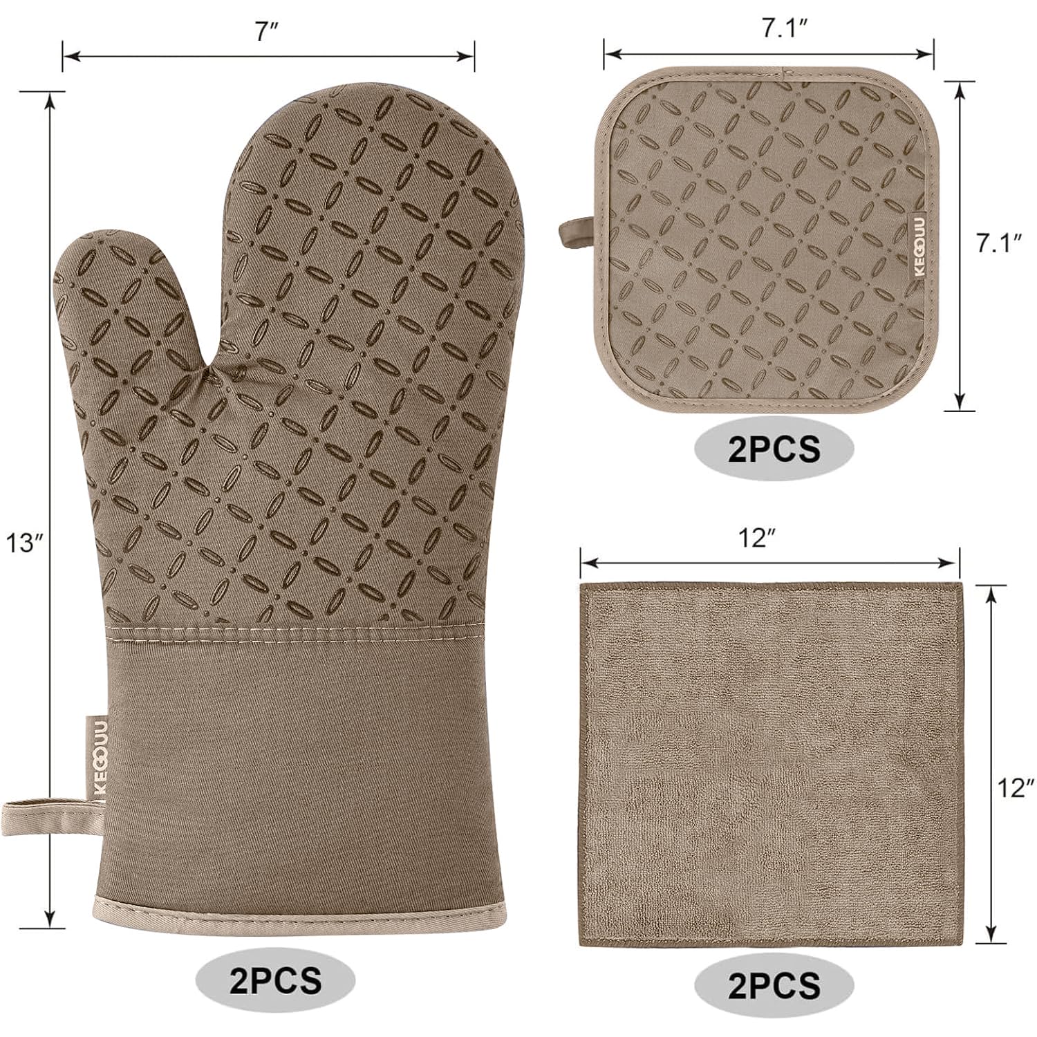 6 PIECE KITCHEN ACCESSORY SETS: Our oven mitts and pot holders set including 2pcs non-slip surface silicone kitchen oven gloves (7X13in), 2pcs pot holders (7X7in) and 2 kitchen towels (12x12in), fit for indoor cooking, baking,BBQ or outdoor grilling. Also the oven mitt set is a perfect ideal kitchen gift for women, men, baker, cooker