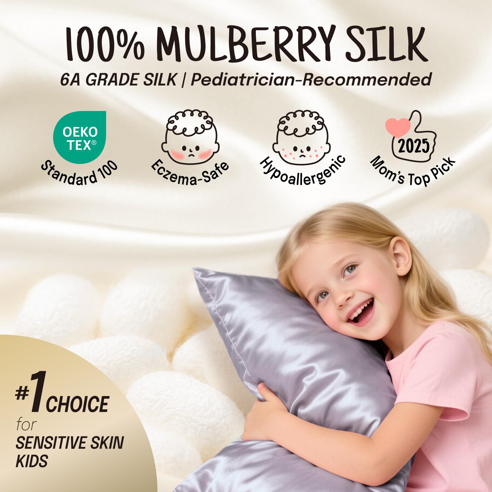 Natural Mulberry Silk·Skin-Friendly and Soft: Crafted with 100% 19MM premium mulberry silk, this pillowcase features a smooth, cloud-soft texture. Gentle on kids’ delicate skin, it wraps them in cozy comfort for restful sleep every night.