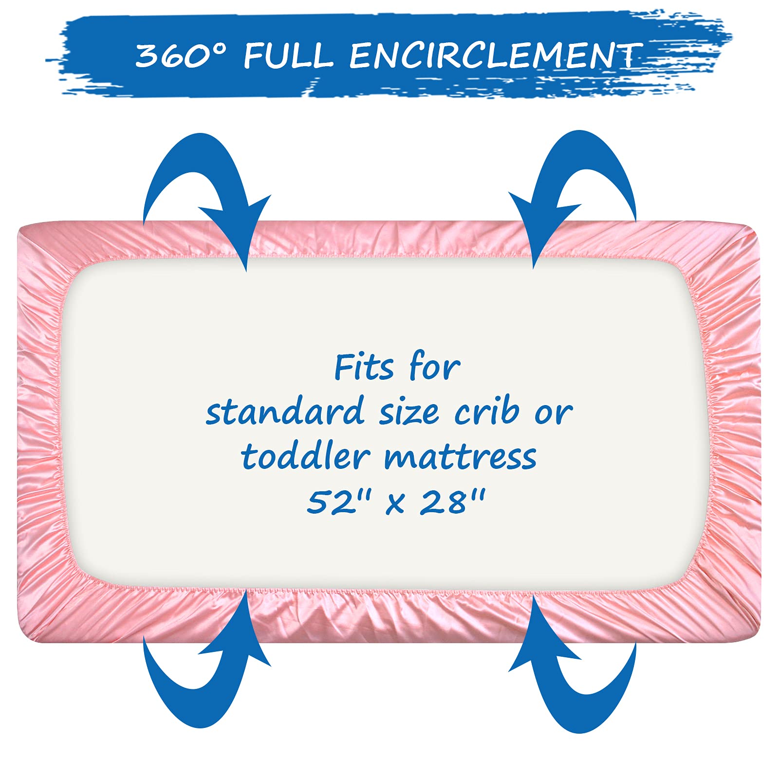 Not Only Fitted, But Snug: Measures 52"L x 28''W x 8''H. Perfectly fit most standard crib mattresses. Each satin crib sheet comes with an elastic band encased at the bottom for safety.