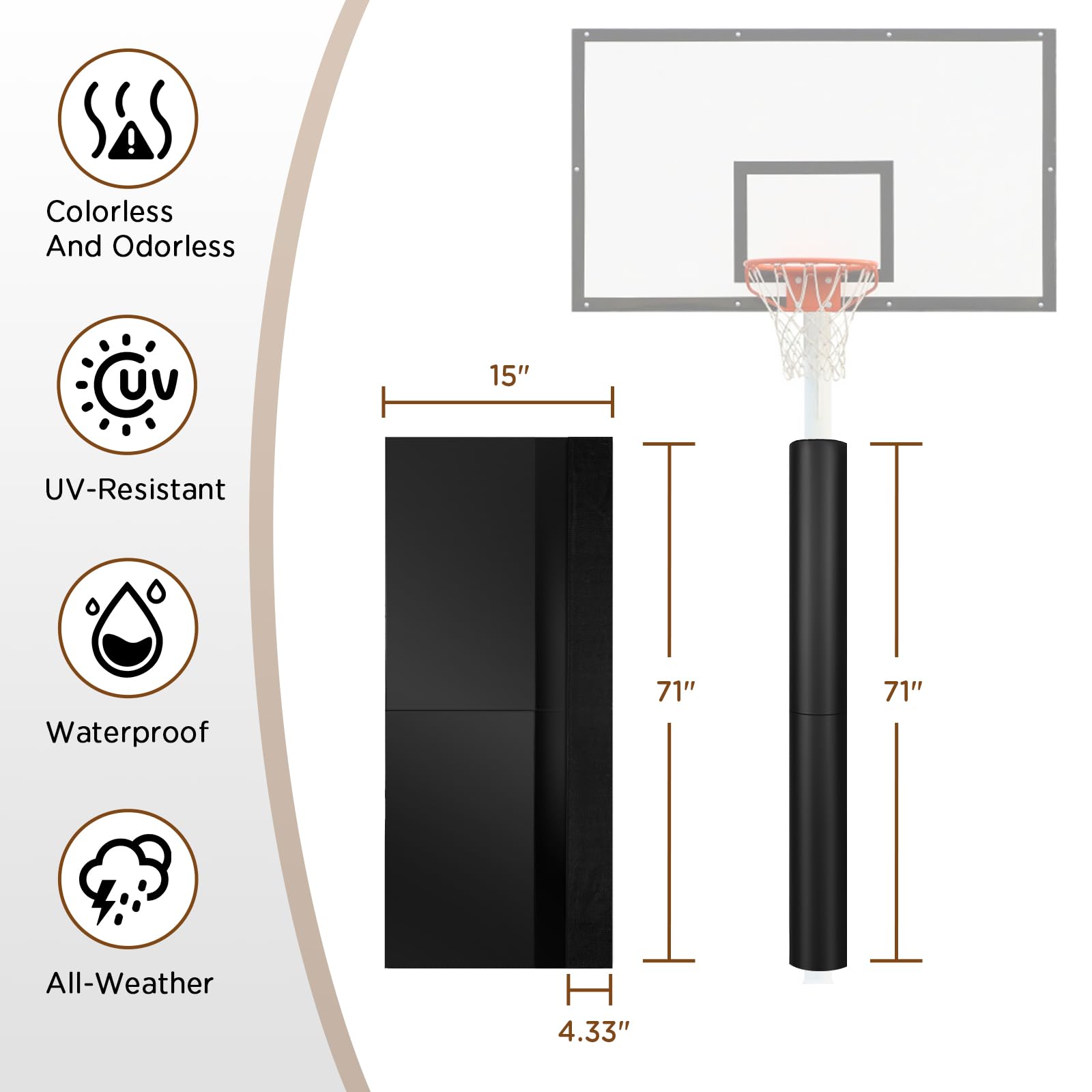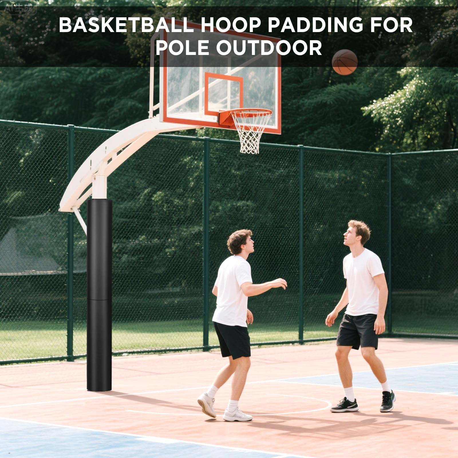 Basketball Pole Padding Our basketball pole padding outdoor seamless 360° coverage designed specifically for basketball poles is an suitable option for indoor safe use. Key Features: 4.33" Reinforced Straps - Features extra-wide 4.33" hook-and-loop straps (±0.5" tolerance) accommodate 3" to 4.5" diameter poles 360° Protection - seamless coverage to shield basketball poles,Water-resistant material helps repel rainwater and is designed for comprehensive protection of basketball poles Flame-Resistant - Essential for basketball court facilities, PVC-coated fabric interior with flame-resistant properties for added protection while maintaining high-performance outdoor pole pad durability. Multi-Scenario Use - Whether in a school gym, parking lot, or outdoor pole padding, this basketball blocking pad delivers consistent protection, combining weatherproof goal outdoor pole padding for basketball toughness with outdoor all weather pole pad resilience. Specifications: Standard Size: 60"H × 12"W | Fits 3"-3.5" poles Large Size: 72"H × 15"W | Fits 4"-4.5" poles 1 x JOMOQ Basketball Pole Pad