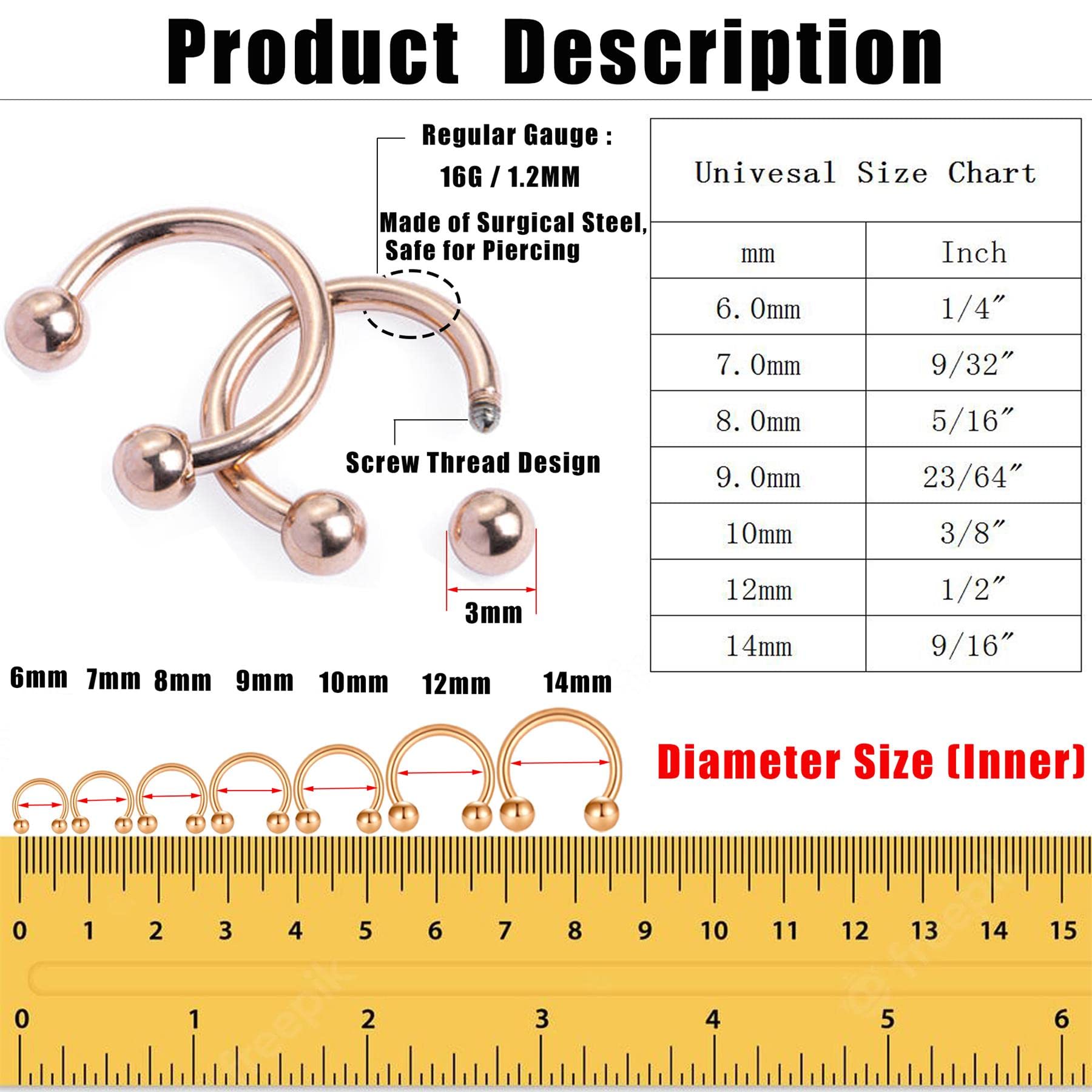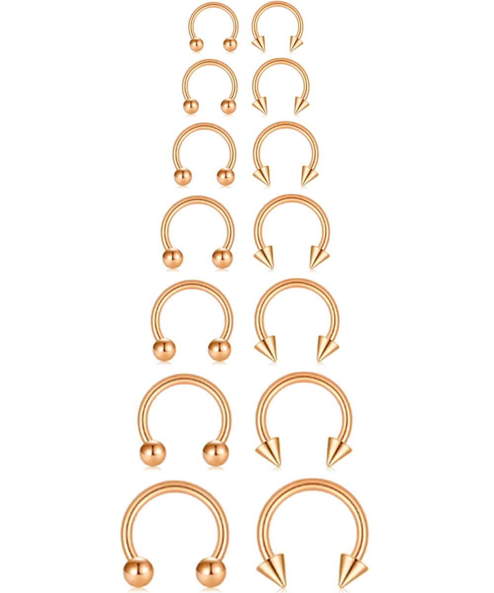 【7 PAIRS of 16G HORSESHOE RINGS SET in DIFERENT SIZES】Regular gauged: 16Ga/1.2mm, Ball size : 3mm, Inner diameter of hoops from 6mm, 7mm, 8mm, 9mm, 10mm, 12mm and 14mm; Different size of small body piercing jewelry multipack for multiple pircing, Good chioce for septum, smiley, nose, nostril, lip and labret piercing, Also practical as cartilage earrings, helix earrings, tragus earrings, rook earrings and daith earrings