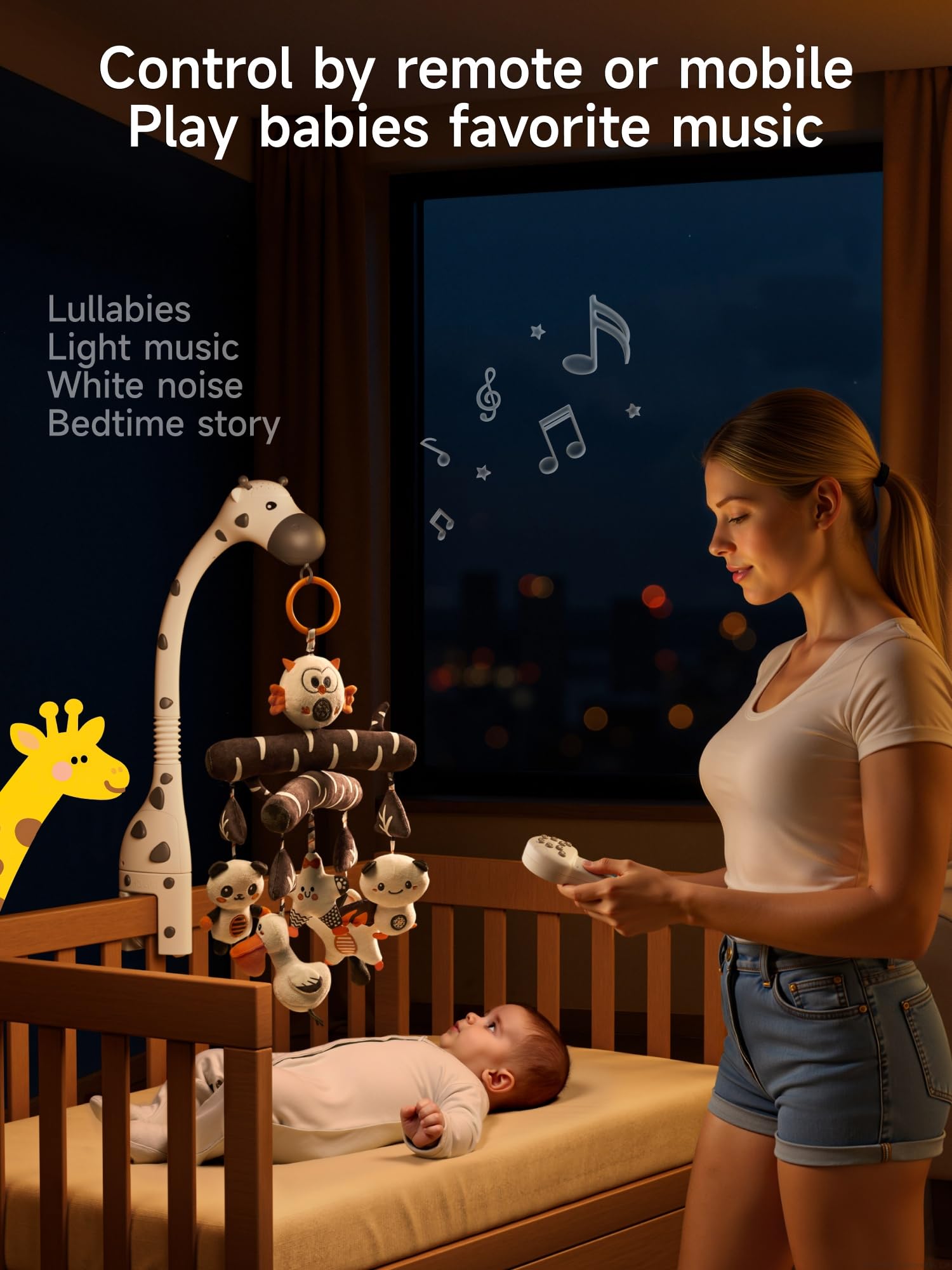 MUSIC,WHITE NOISE,STAR PROJECTOR 3-IN-1: The mobile has soothing lullabies and white noise for baby sleeping for baby sleeping,you can control the volume freely up or down via the baby mobile or the remote control;It has 4 colors (blue,green,red and colorful) projection lights. Night light projects a starry ceiling or wall, brings a comfort and magical star images to your baby during quiet or nap time.