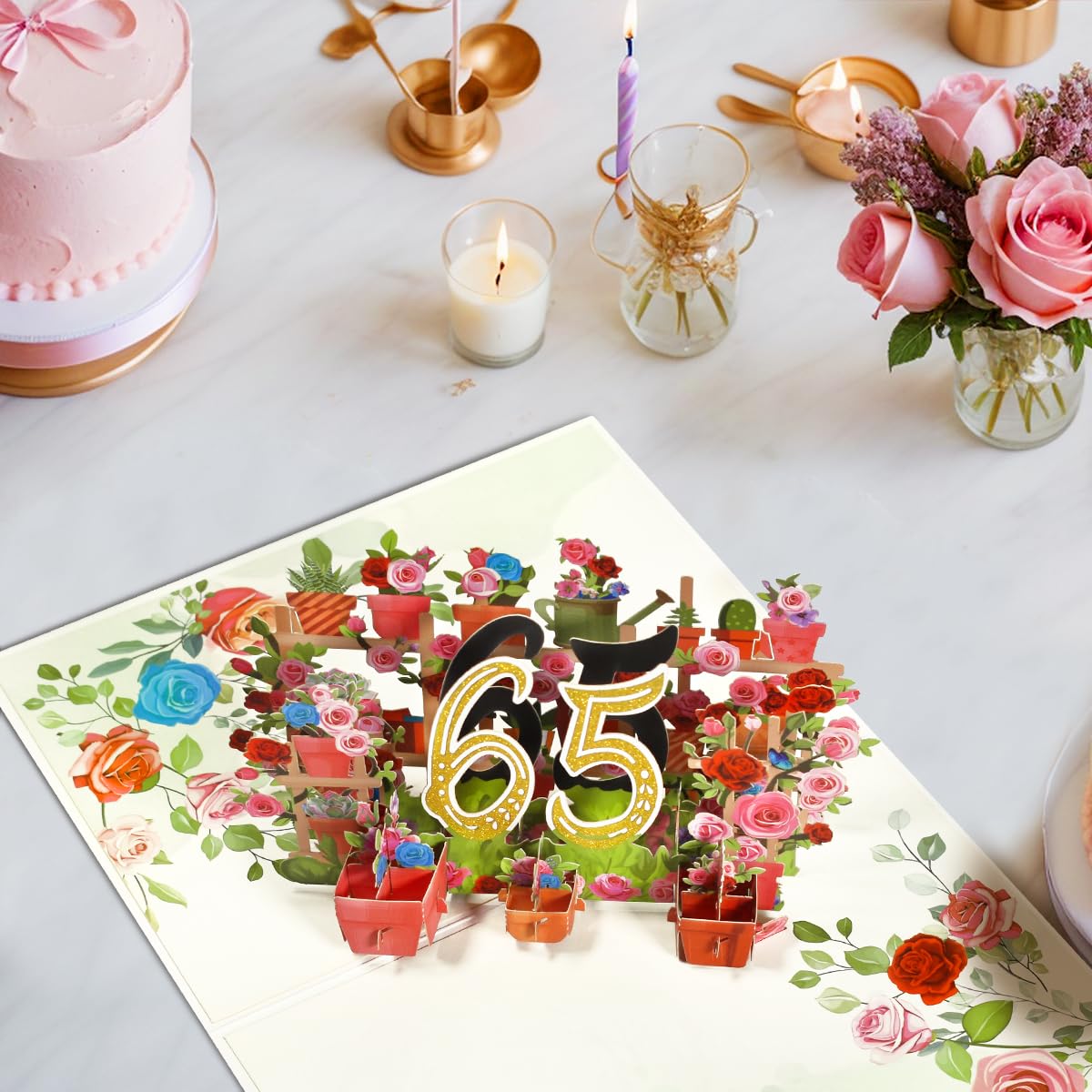【65th Birthday Cards】The beautiful pop-up flower birthday card features an exciting and unique 3D design. Open the card to a scene of happiness with flowers, presents, and an "65" at the center of the card. Give it to your loved one or your parents, grandparents and it will surely surprise and delight them.