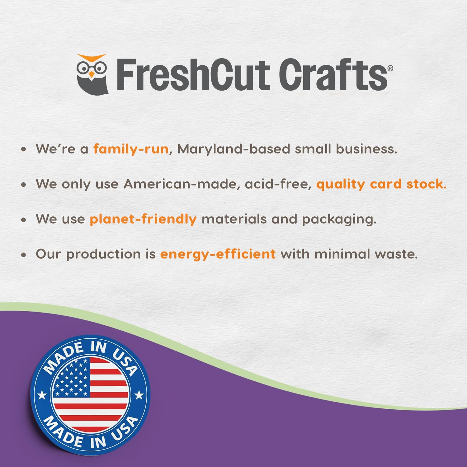 FEEL-GOOD CRAFTING: At FreshCut Crafts, we're all about crafting with a conscience. Our products are not only about creativity but also about making a positive impact. Proudly family-made in the USA, we use high-quality, acid-free American-made paper that's perfect for preserving memories and creating lasting keepsakes. Our energy-efficient production processes are designed to minimize waste, ensuring that we leave a smaller footprint on the planet.