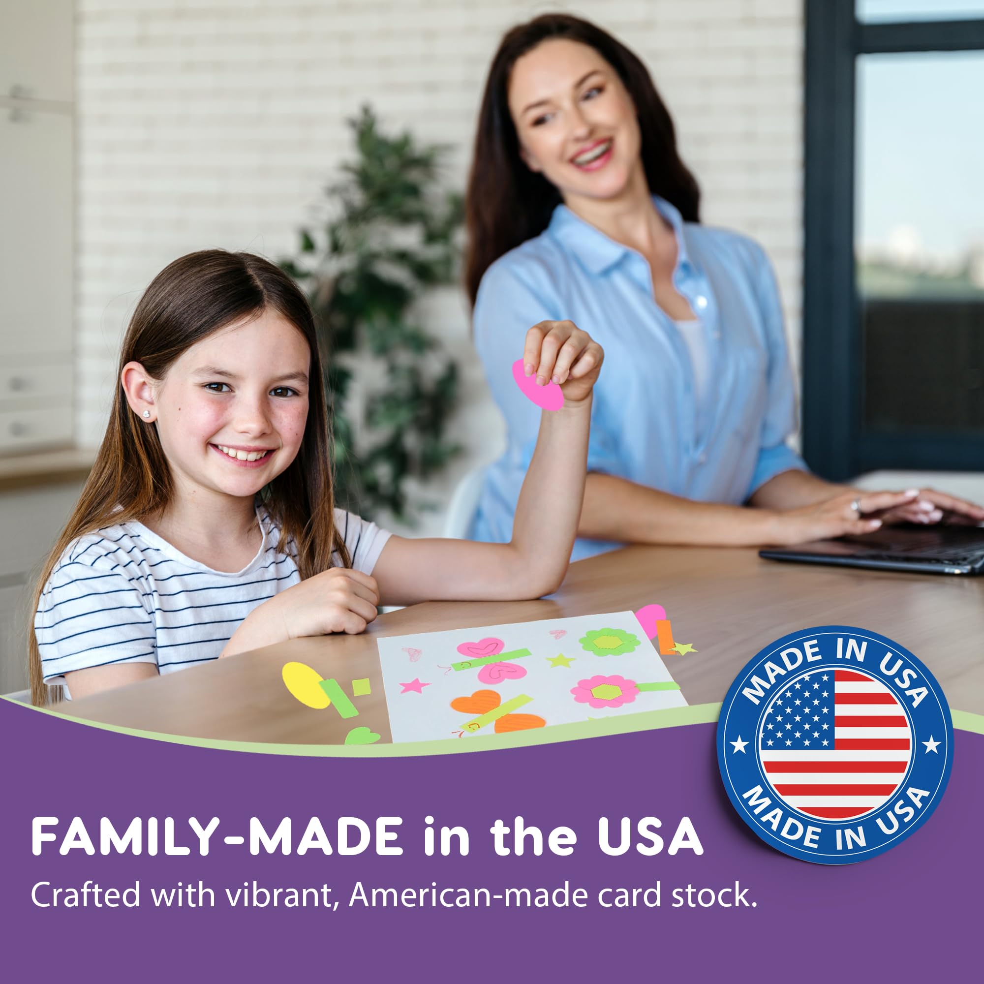 DURABILITY OF HIGH-QUALITY CARD STOCK: Each set includes 16 sheets of sturdy, US-made high-quality card stock that holds easy punch-out shapes. The card stock comes in four bright NEON colors, adding a vibrant touch to your projects. With a total of 696 pieces, you'll have plenty of shapes to fuel your creativity. Our products are not printed, not construction paper, and not foam shapes—ensuring that you get the highest quality materials for your crafting needs.