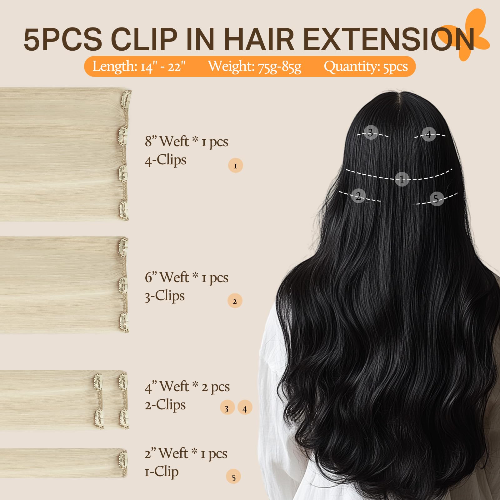 Piece Optimization: 5 piece clip-in extensions add volume and length.These pieces can be combined with other extensions for added versatility. Includes: 8" (1), 6" (1), 4" (2), 2" (1). Weights: 75g (14/16 inch), 80g (18/20 inch), 85g (22 inch)