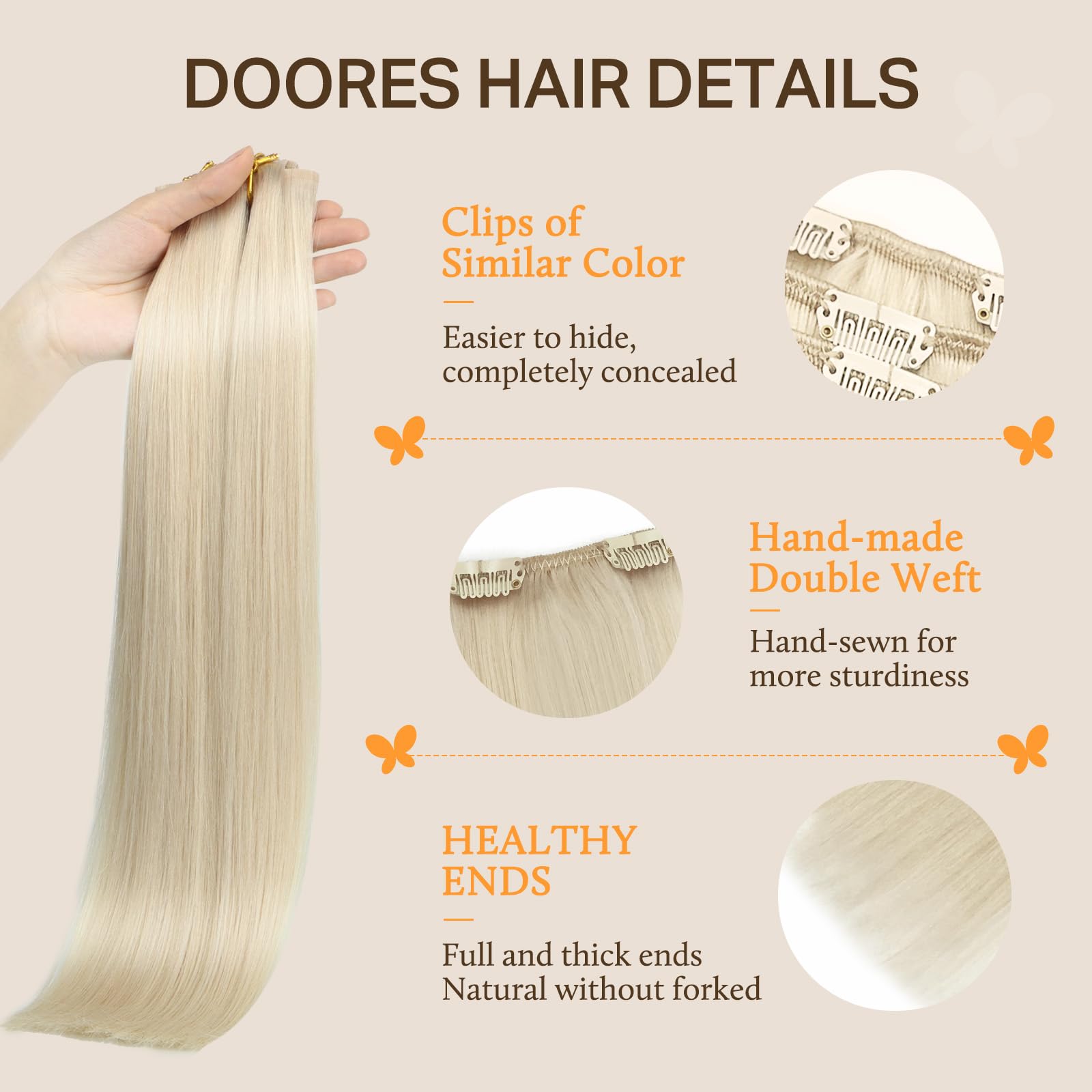 High Grade High-Quality Hair: DOORES 9A grade clip-in hair extensions are 100% human hair, soft, no knots and split ends. They can be permed, dyed and styled easily. Simple to wear and remove in 3 minutes, require minimal maintenance for effortless beauty