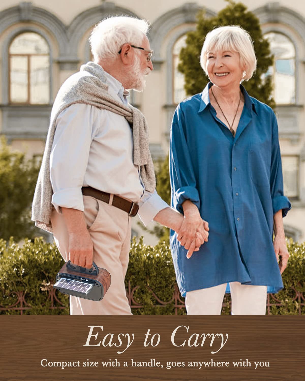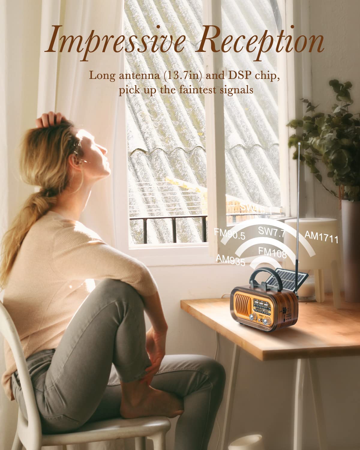 【3 Ways to Supply Power】USB charging is convenient for your daily use, retro radio bluetooth is built-in 1200mAH rechargeable battery is perfect choice when you have a backyard BBQ. . 2*D battery (not included) is essential in case of power outages. Equipped with a large solar panel(Size: 4.1 x 2.3 x 0.1in) with high charging efficiency, bluetooth radio am fm will collect power sustainably while you’re doing ourdoor activities.