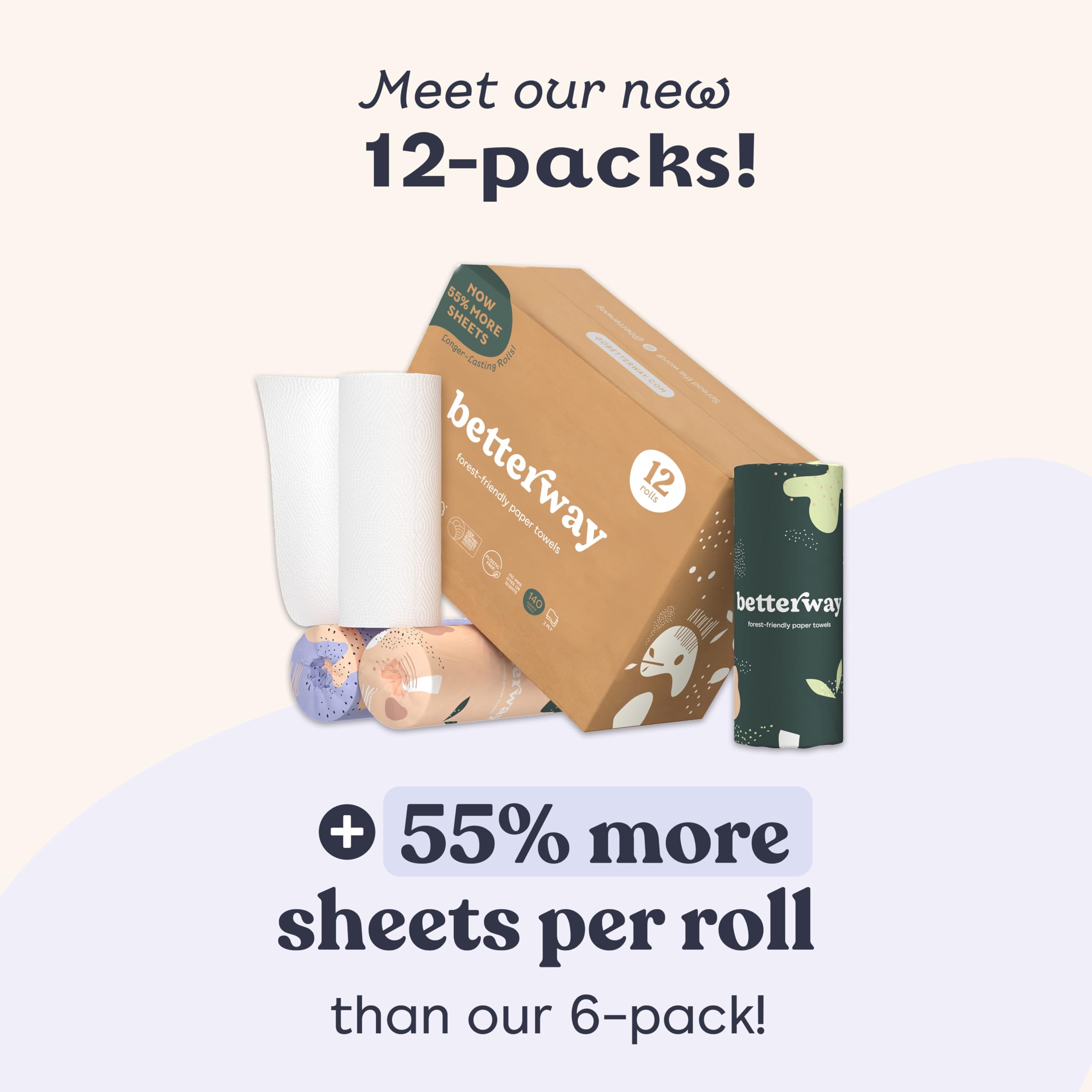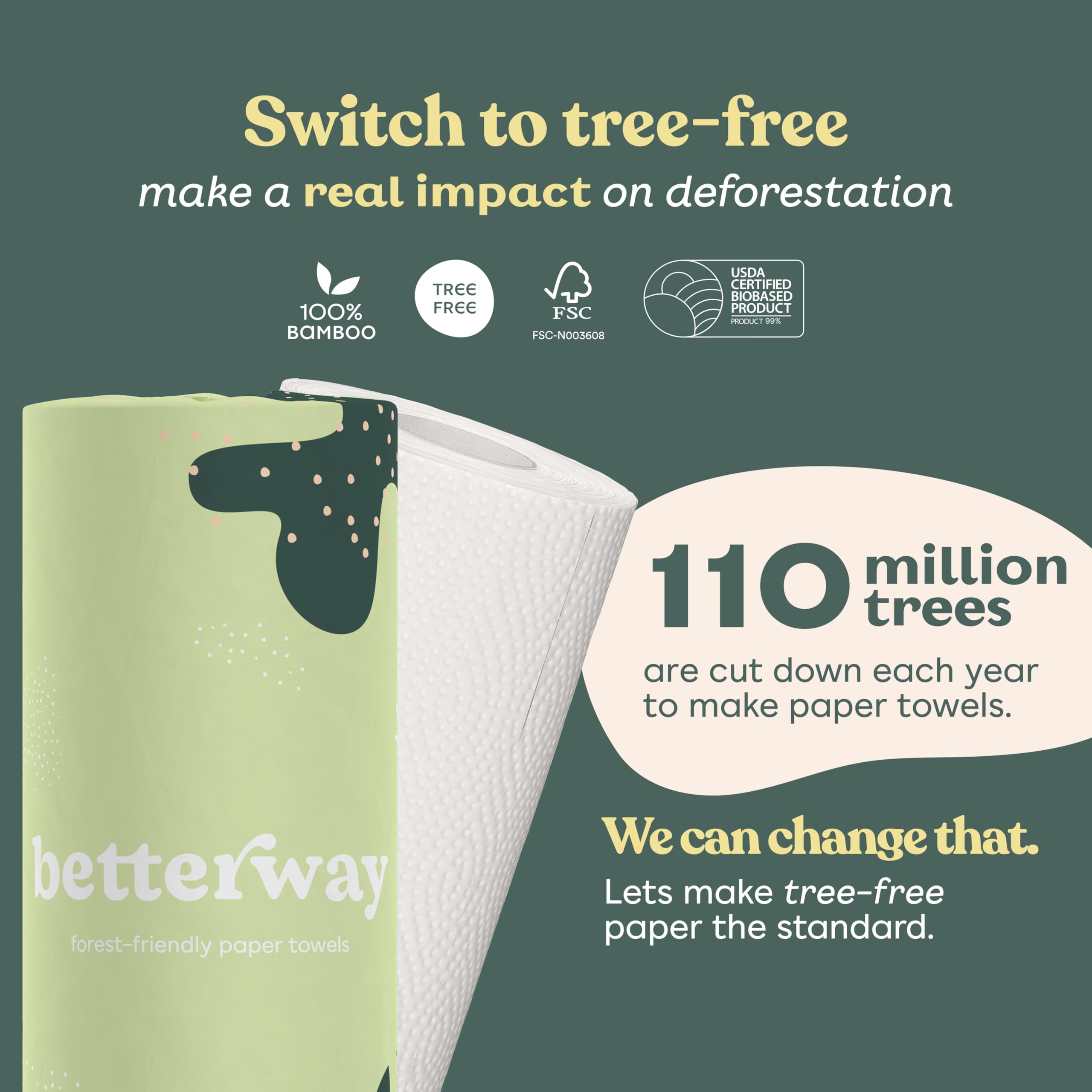 12 ROLLS, 1,680 SHEETS — STOCK UP AND SAVE — More rolls, more sheets, and more value per box than the 6-pack; subscribe and save for automatic reorders so you never run out; tree-free, plastic-free, and FSC certified bamboo paper towels built for households that actually go through them