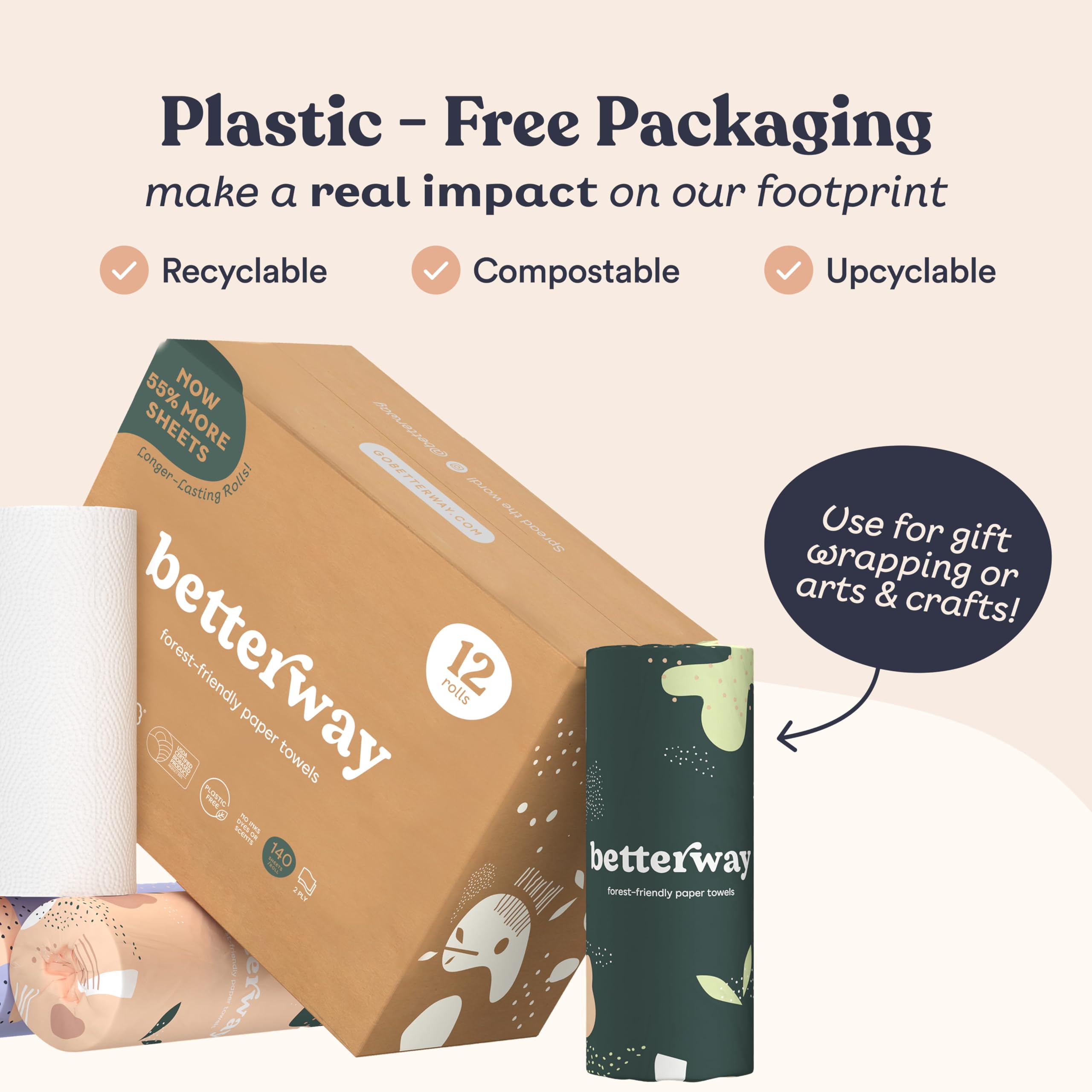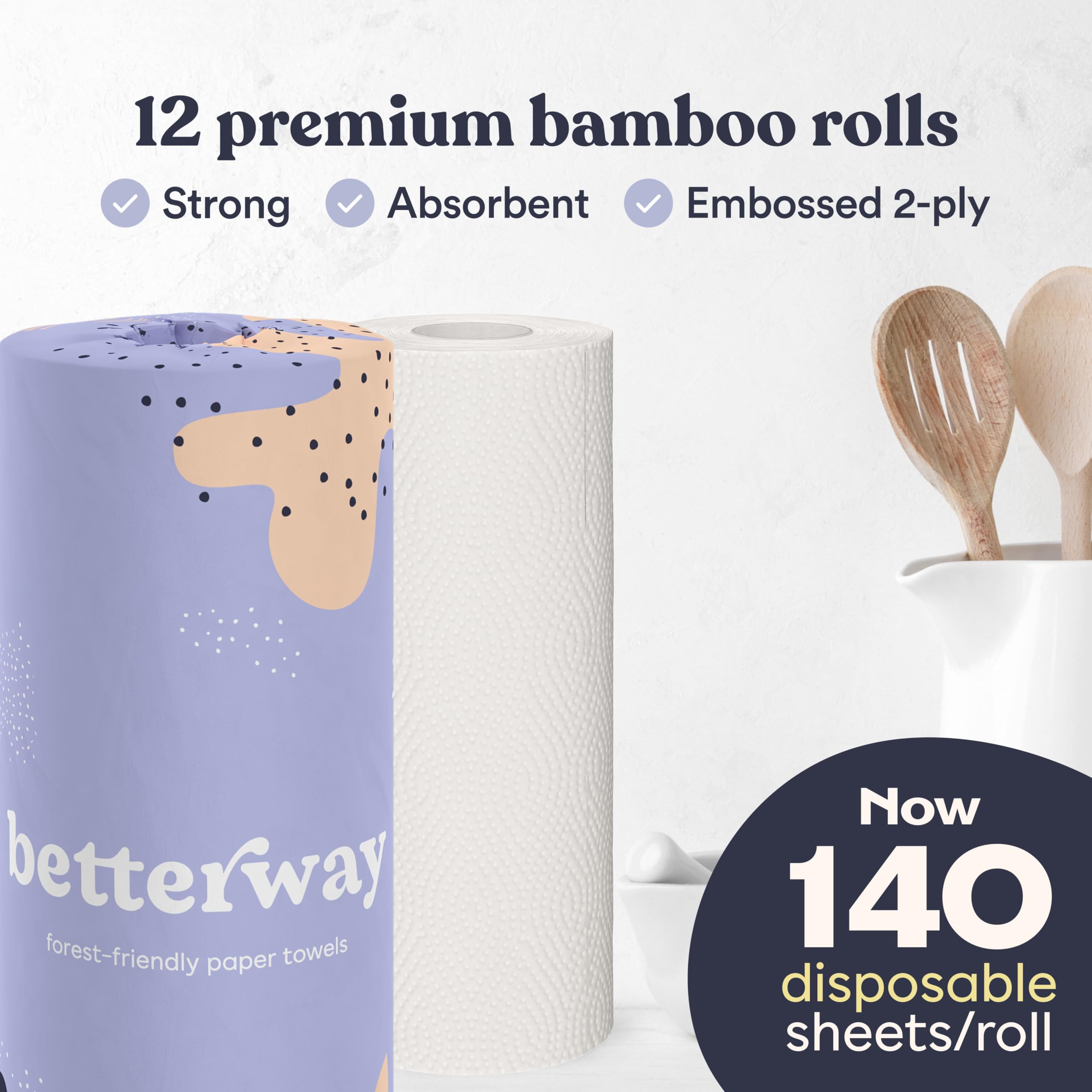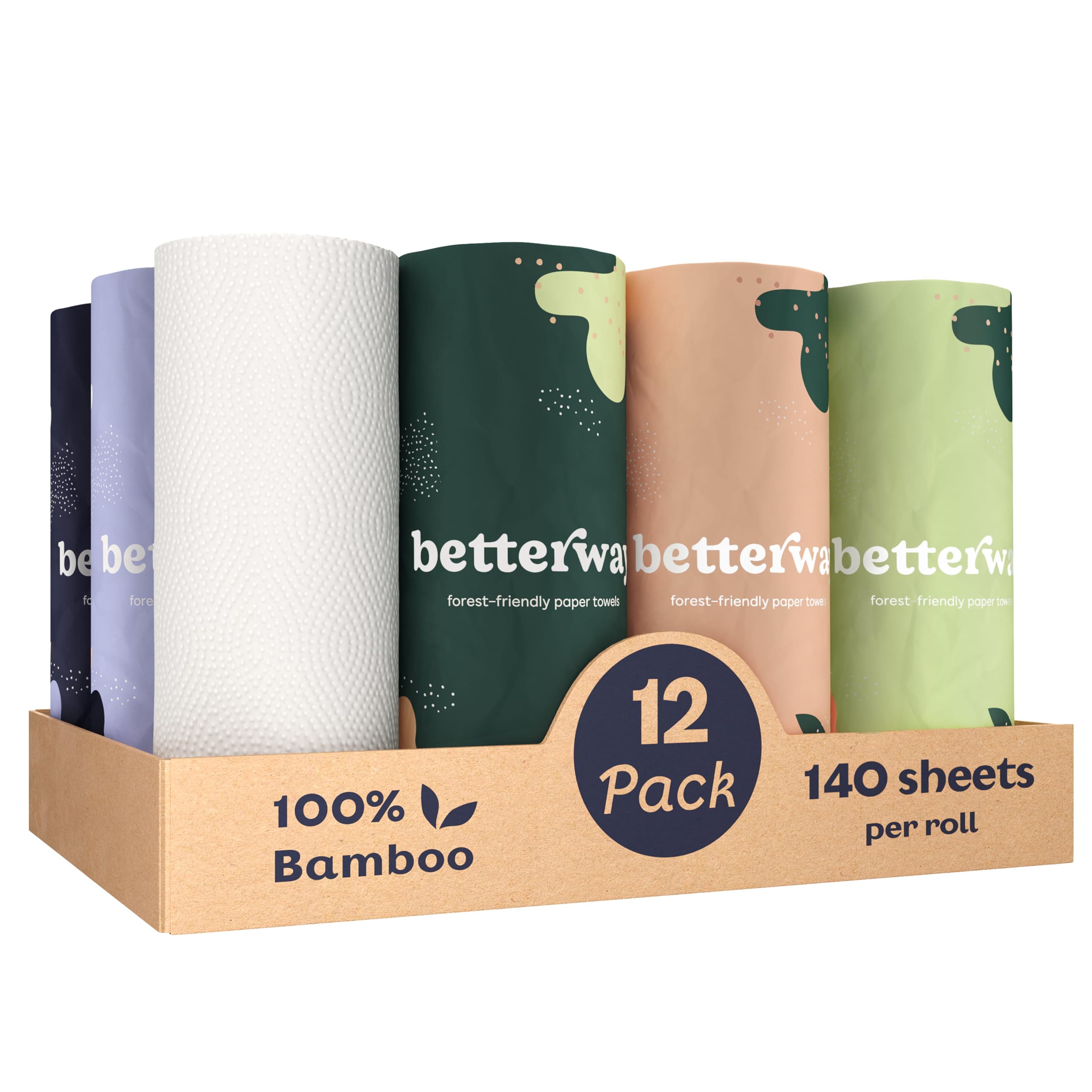 Most bamboo paper towels make you choose between the planet and the paper towel. Thin sheets. Small rolls. The nagging feeling that you used six of them to clean up what Bounty would have handled with one. Betterway's bamboo paper towels are built to end that trade-off. At 24 GSM and 2-ply construction — the thickest in their category — these sheets hold together when wet, absorb more per swipe, and won't shred mid-mess. Each roll has 140 sheets, and this 12-pack gives you 1,680 total. That's a meaningful amount of paper towel for a household that actually goes through them. They're made from 100% FSC certified bamboo, one of the fastest-growing plants on earth — reaching full maturity in 3 to 5 years compared to 30 or more for the trees most paper towels come from. No plastic anywhere in the packaging. Each roll arrives individually wrapped in recyclable paper. Fully compostable after use. For anyone who's switched products to reduce what comes into their home, these are non toxic and free from PFAS, BPA, dyes, parabens, and formaldehyde. No added fragrances. Whitened using an ECF process — no elemental chlorine. Safe for food prep surfaces, baby messes, and households with chemical sensitivities. Half-sheet perforations let you match the sheet size to the job. Lint-free finish means no residue on glass or surfaces. Strong enough wet or dry. Compostable when you're done. A cleaner paper towel, from a better source. Tree-free, plastic-free, and built to actually work.