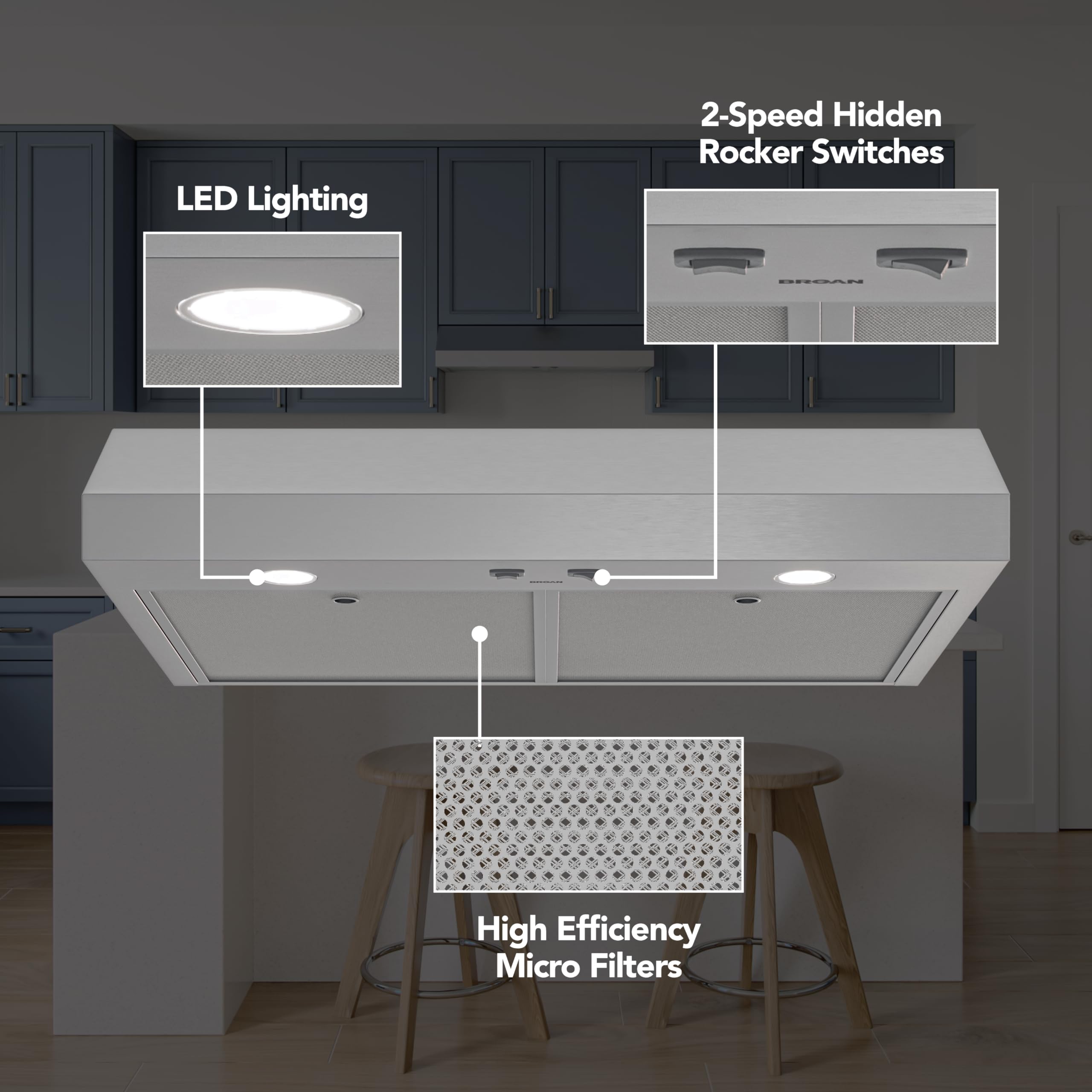 20% MORE EFFECTIVE: Trust in the Broan-NuTone brand to more effectively remove pollutants in your kitchen than the leading competitor, with strong airflow at 350 Max Blower CFM. Bright 1-level, heat resistant LED modules (bulbs included) to enhance your cooking experience. Easy-to-clean, fully enclosed bottom with 2 dishwasher-safe high efficiency micro filters