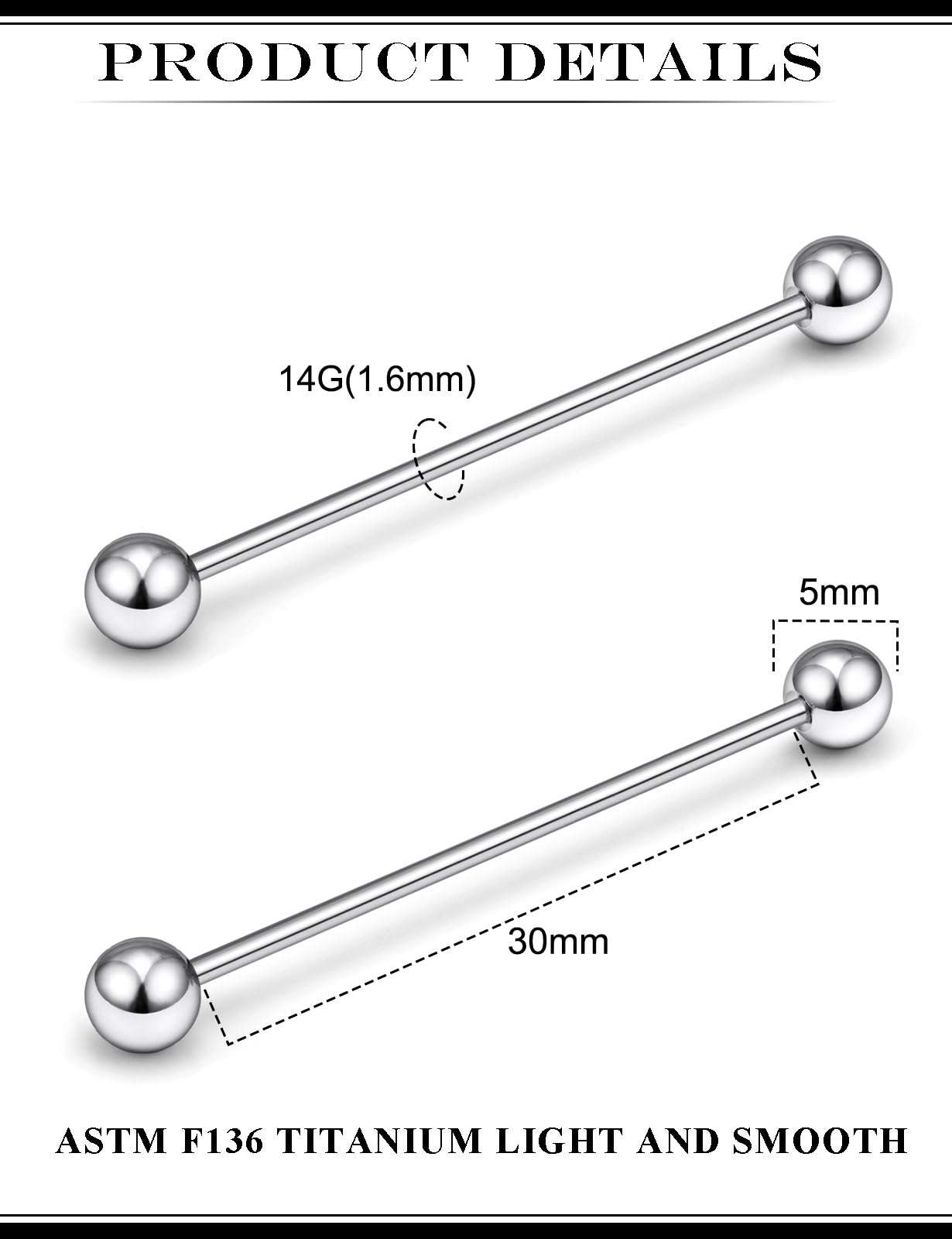【Perfect size】: Straight barbell industrial piercing jewelry gauge: 14G(1.6mm), bar length: 30mm, top ball size: 5mm, color: silver