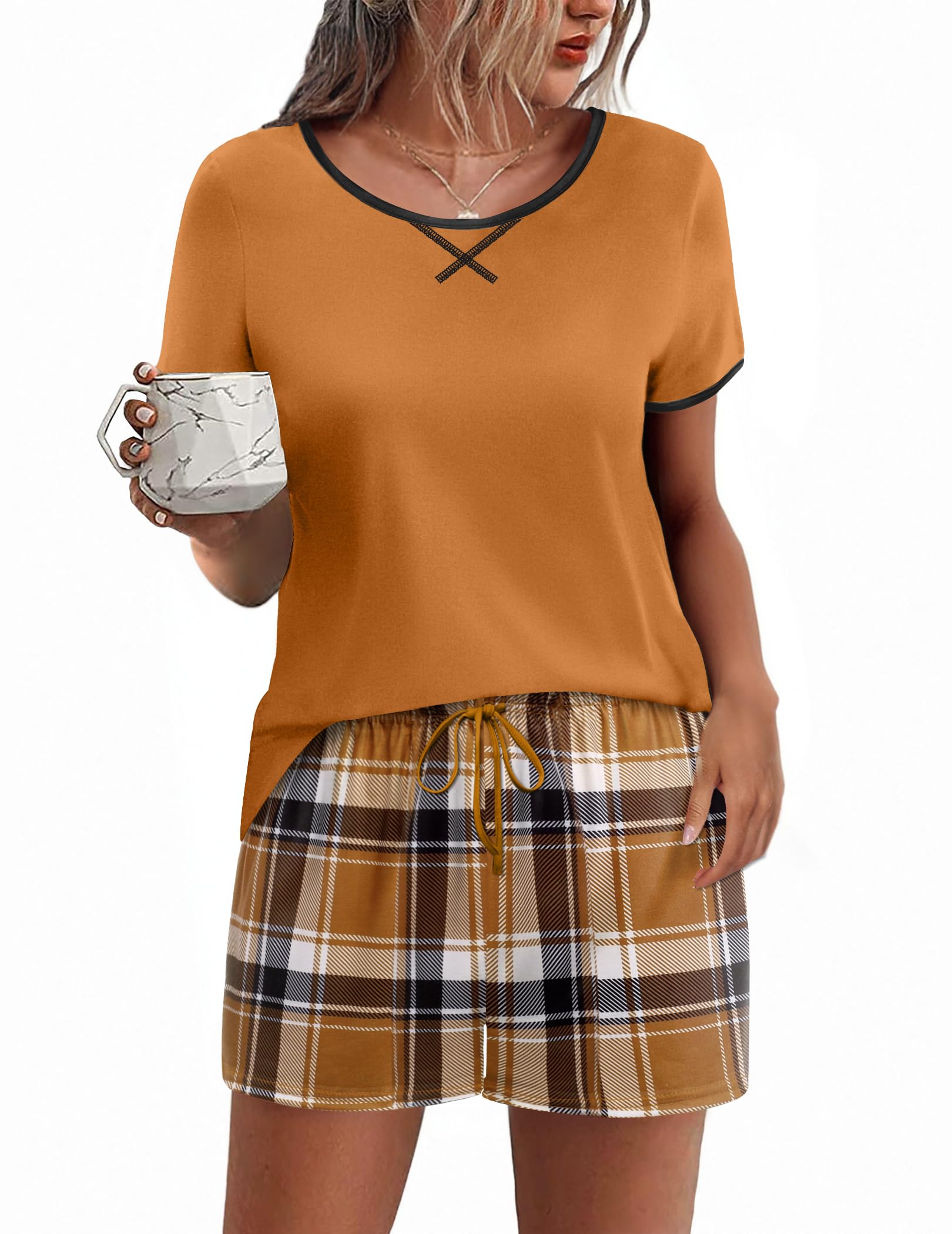 DESIGN&OCCASION:Soft 2 Piece Pajamas Set-TOP with Round-neck,short sleeve,stylish color block, PJ SHORT with Elastic waist,classic plaid & printοΌwhich suitable for every age group. Nice design Short Pajama Set for a relaxing day and night.