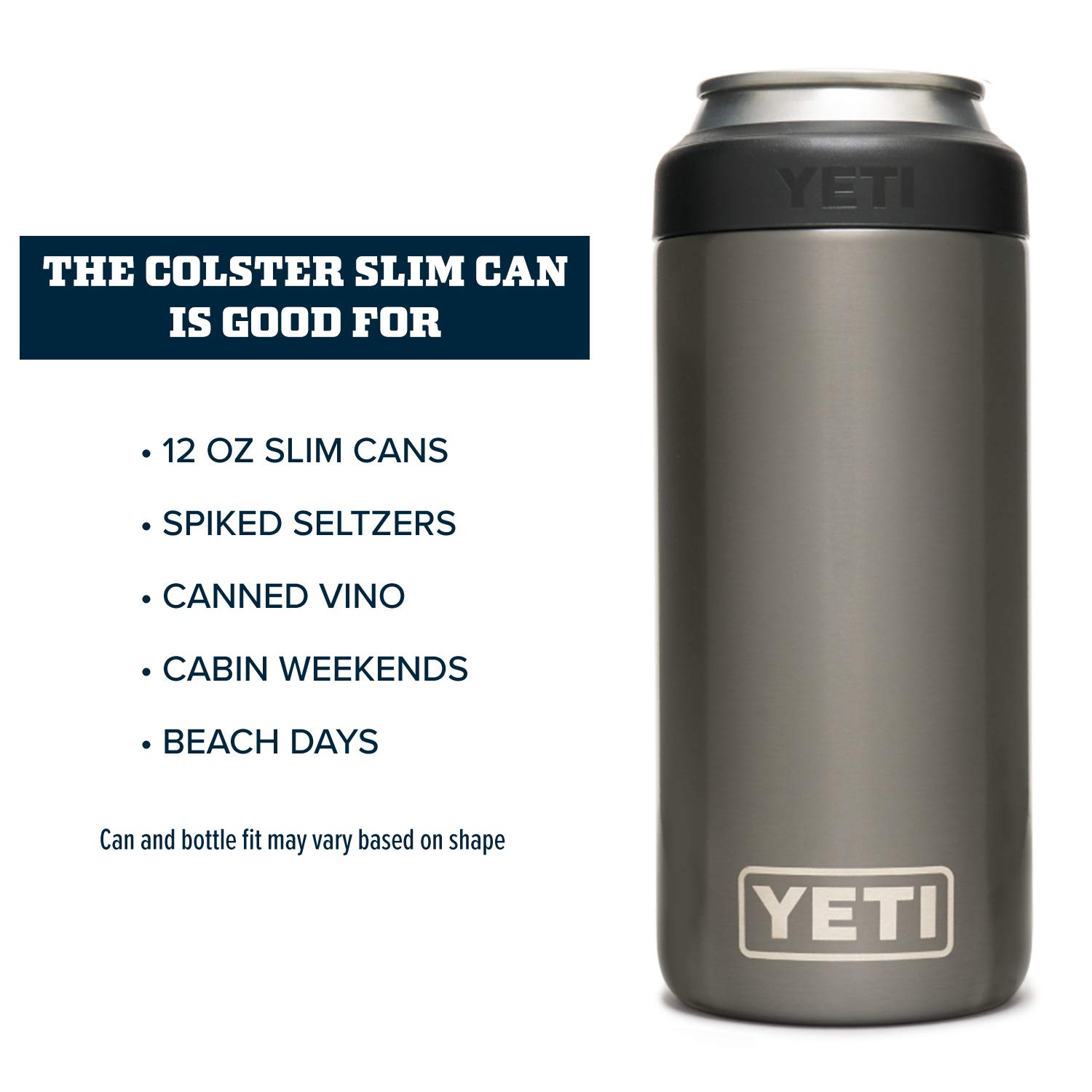 The YETI Slim Colster is good for: 12 oz Slim Cans, Spiked Seltzers, Canned Vino, Cabin Weekends and Beach Days. Can and bottle fit may vary based on shape