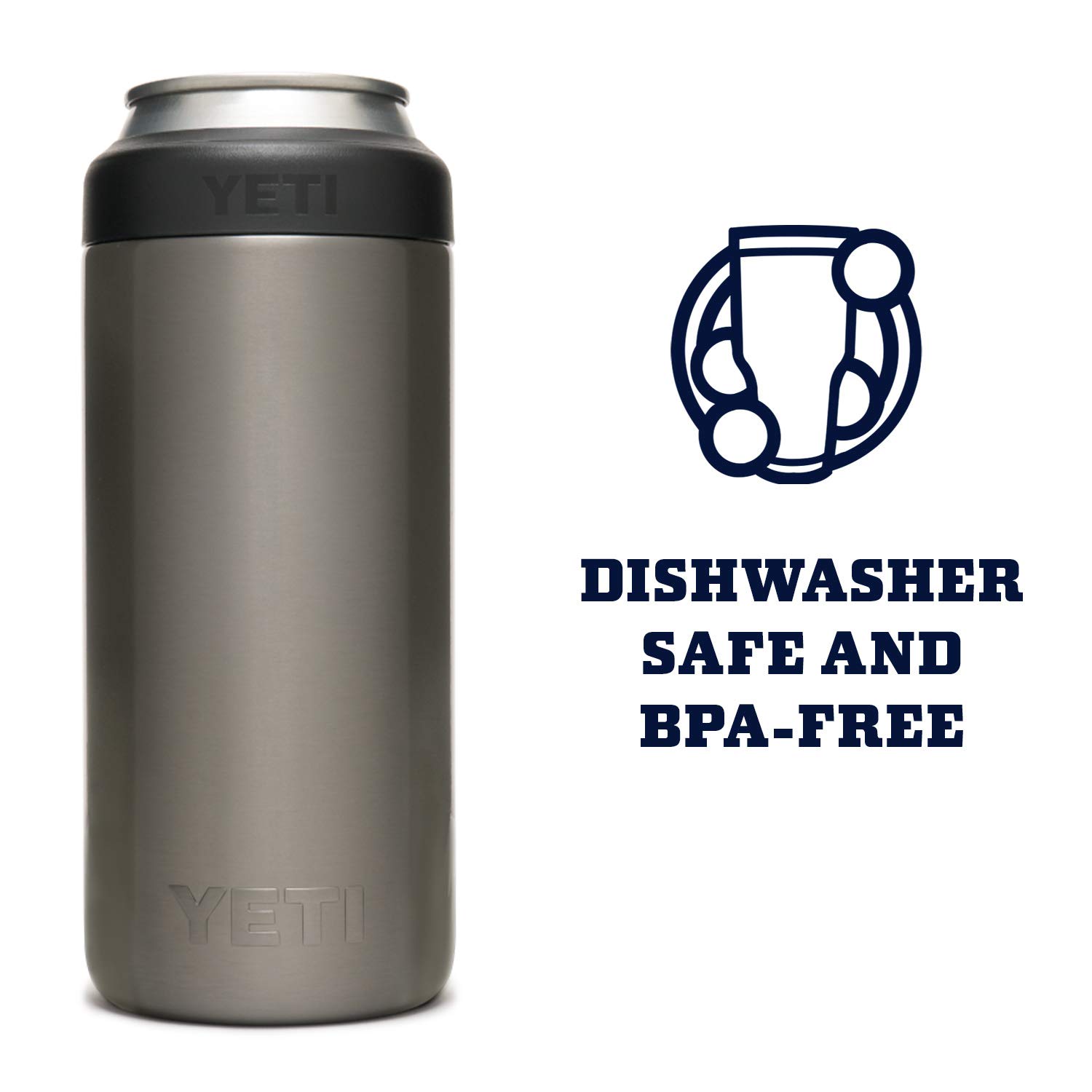 The YETI Slim Colster is dishwasher safe and measures: 2.25 in x 6 in