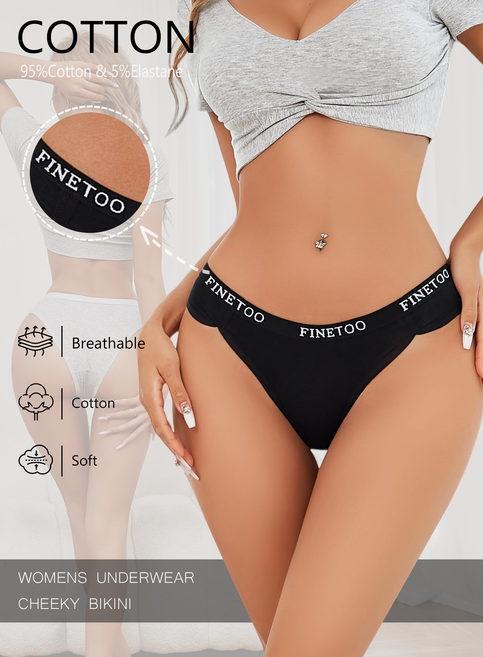 FINETOO Cotton Underwear for Women Cheeky Panties Sexy Hipster Bikini Underwear Elastic Waistband Stretch Briefs 5 Pack