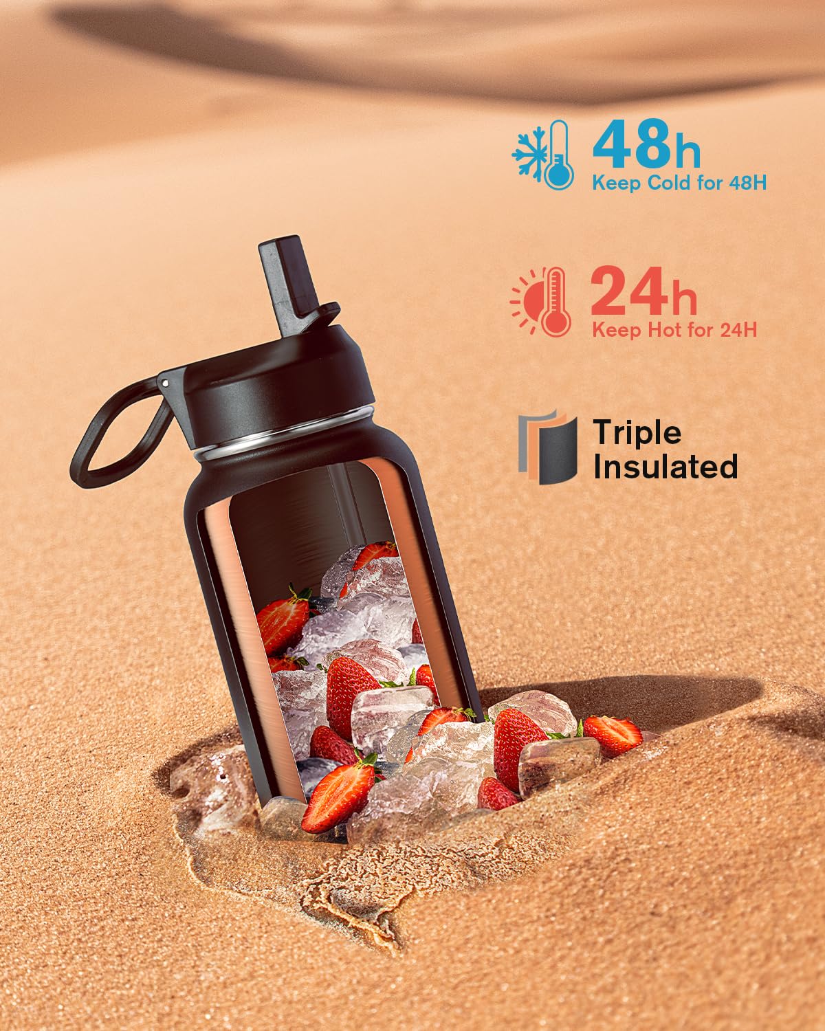 48H Cold & 24H Hot: Triple Insulation Technology adopts double wall and vacuum seal, keeps beverages cold for up to 48 hours and hot 24 hours. Anti-sweat coating can keep the surface dry and clean, making it easy to grip.