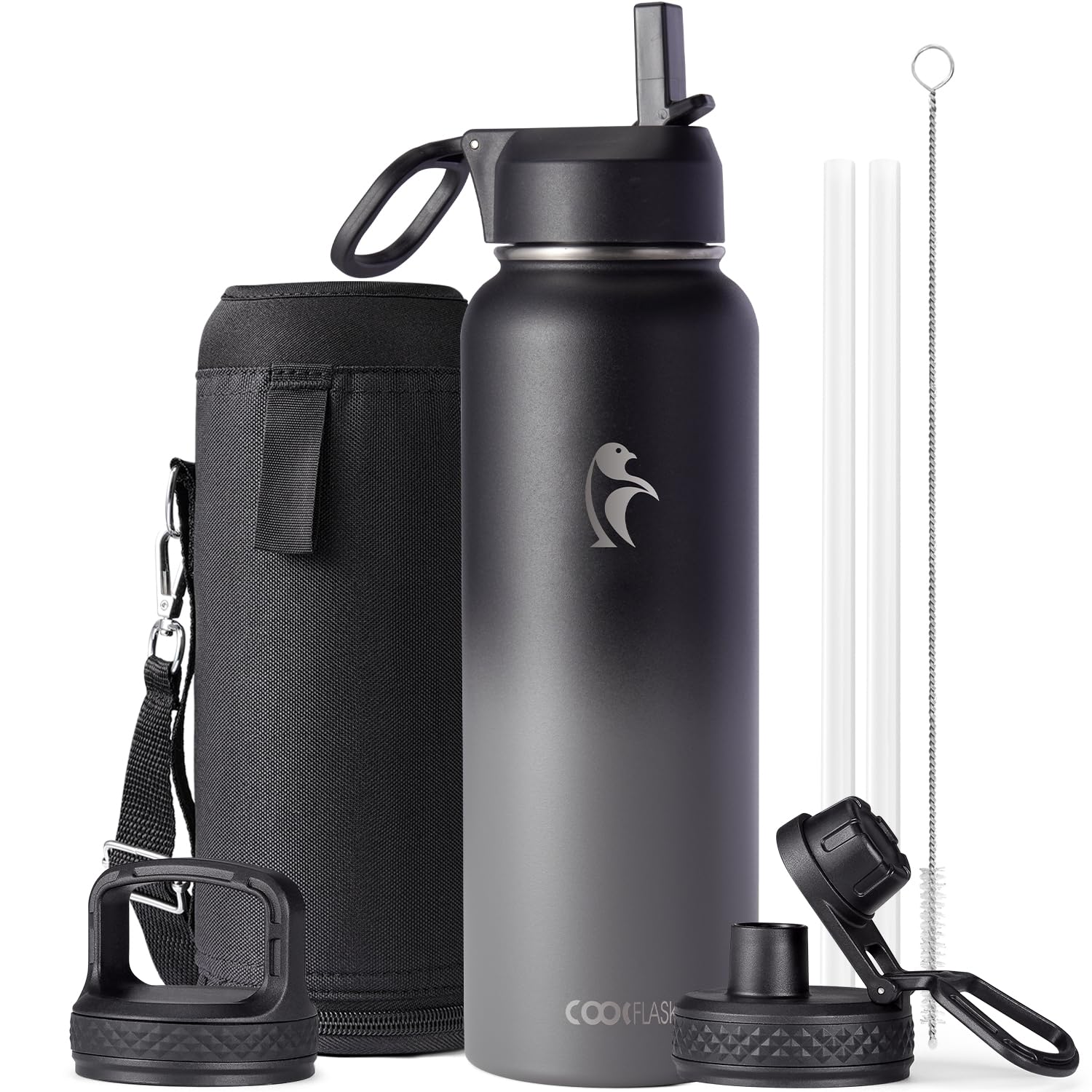 Flexible Drinking On-the-Go: This 40 oz water bottle comes with 3 different lids. The screw-on lid with flip-up handle is for easy ice refilling with superior portability; spout lid makes it convenient to drink hot liquid and straw lid for sipping cold.