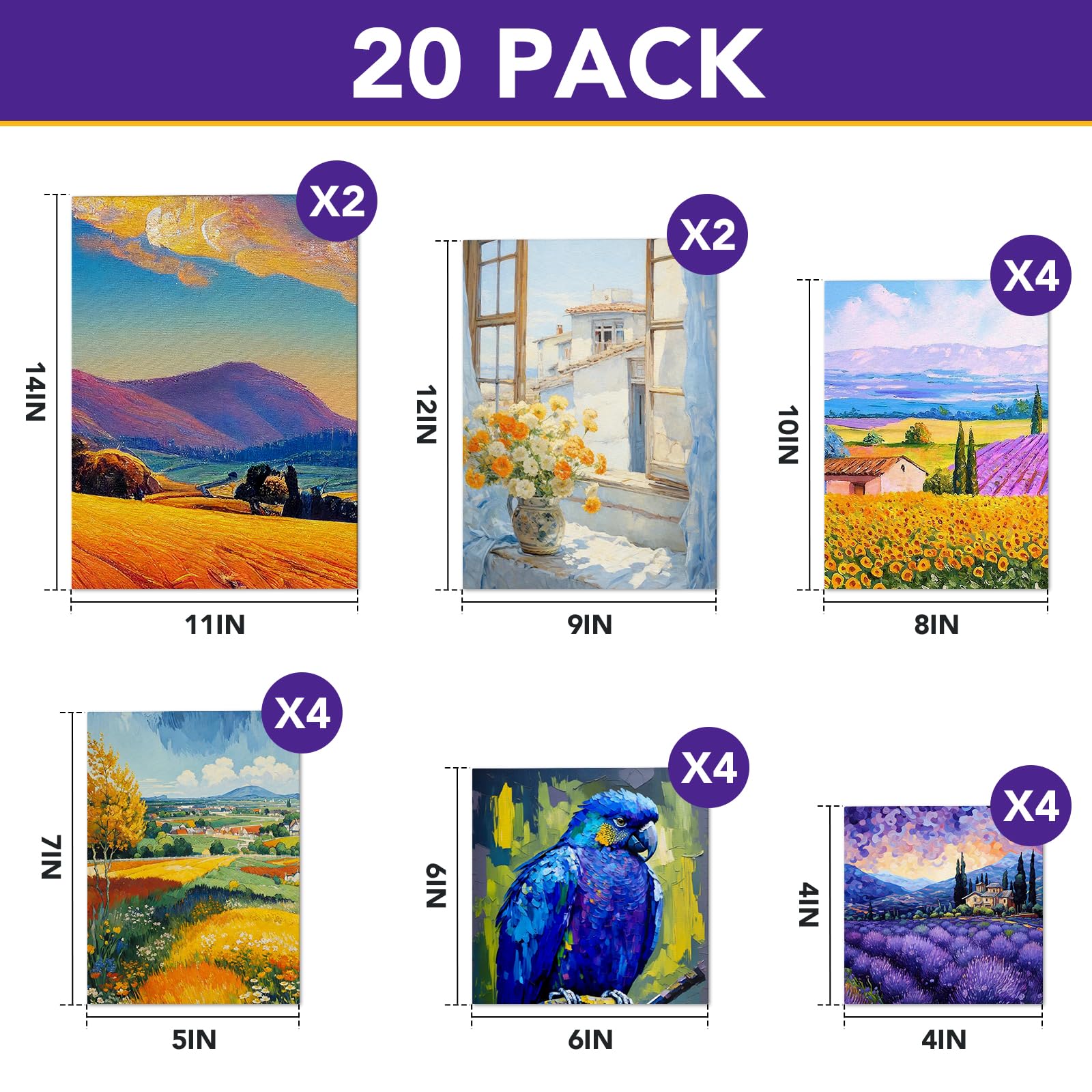 【Paint Canvases for Painting】This canvas set includes 20 pack canvas boards 6 size 4”x4”, 5”x7”,6”x6”, 8”x10”, 9”x12”,11”x14”, small and large canvas for painting well meet the different painting needs of kids, artist or adult.