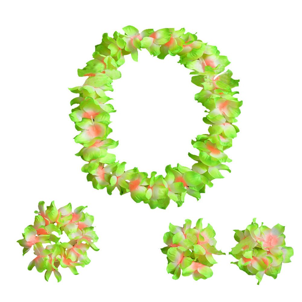 This tropical dancer set includes skirt, pair of flower bracelets, flower headband and flower necklace.
