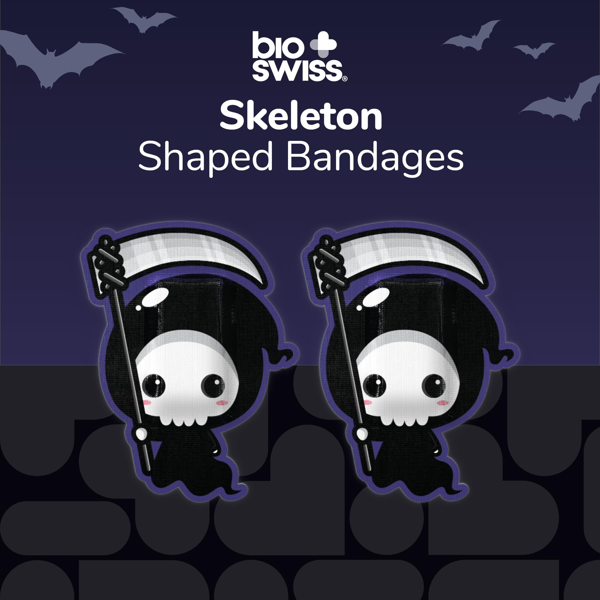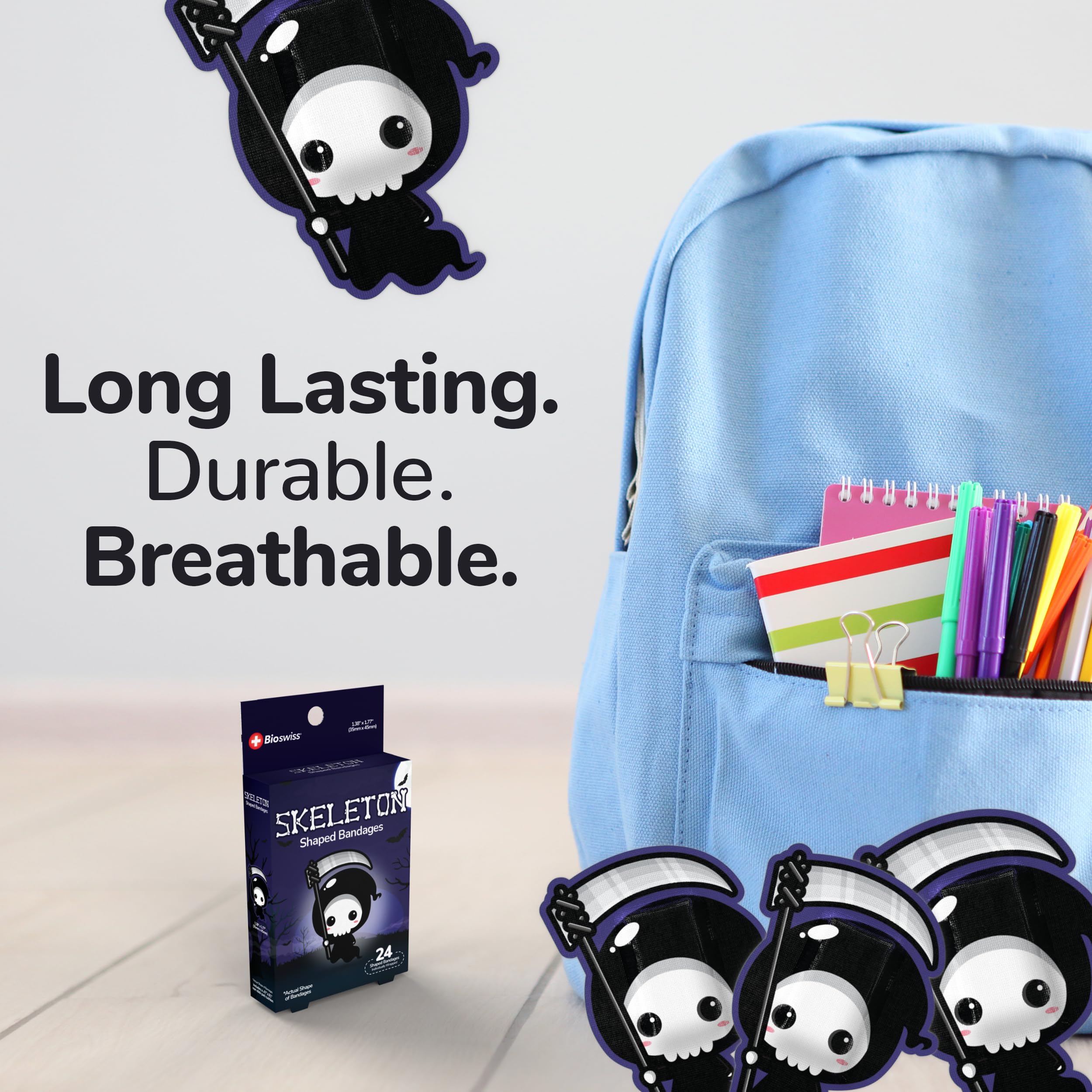 24 HALLOWEEN SKELETONS KIDS BANDAGES: Fun skeleton-shaped adhesive bandages pack helps protect cuts, scrapes, and minor wounds while making healing less stressful for children