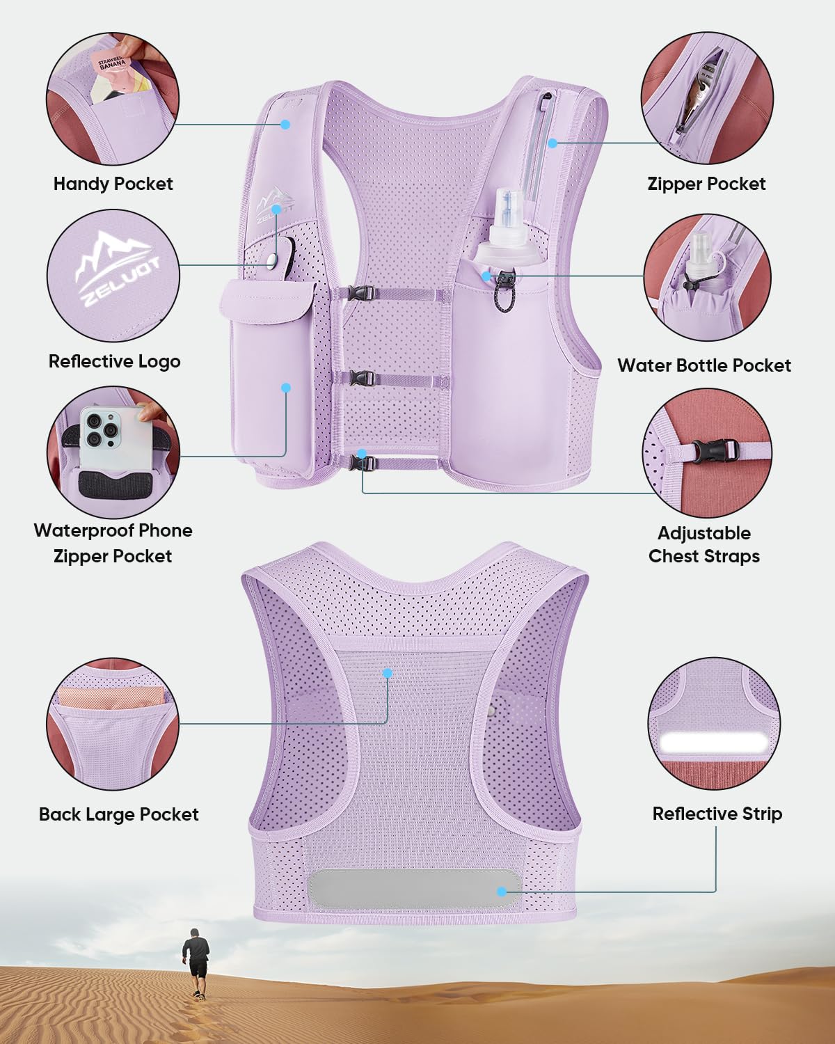 Breathable and Featherlight - Zelvot hydration vest is made from breathable, lightweight neoprene with triple-sized ventilation holes for accelerated air circulation and moisture-wicking. It barely tips the scales at 7.5 ounces, ensuring it won't slow you down. Reflective logo and strip on the front and back increase safety in low-visibility scenarios. This reflective running vest makes every run farther, safer, and more comfortable