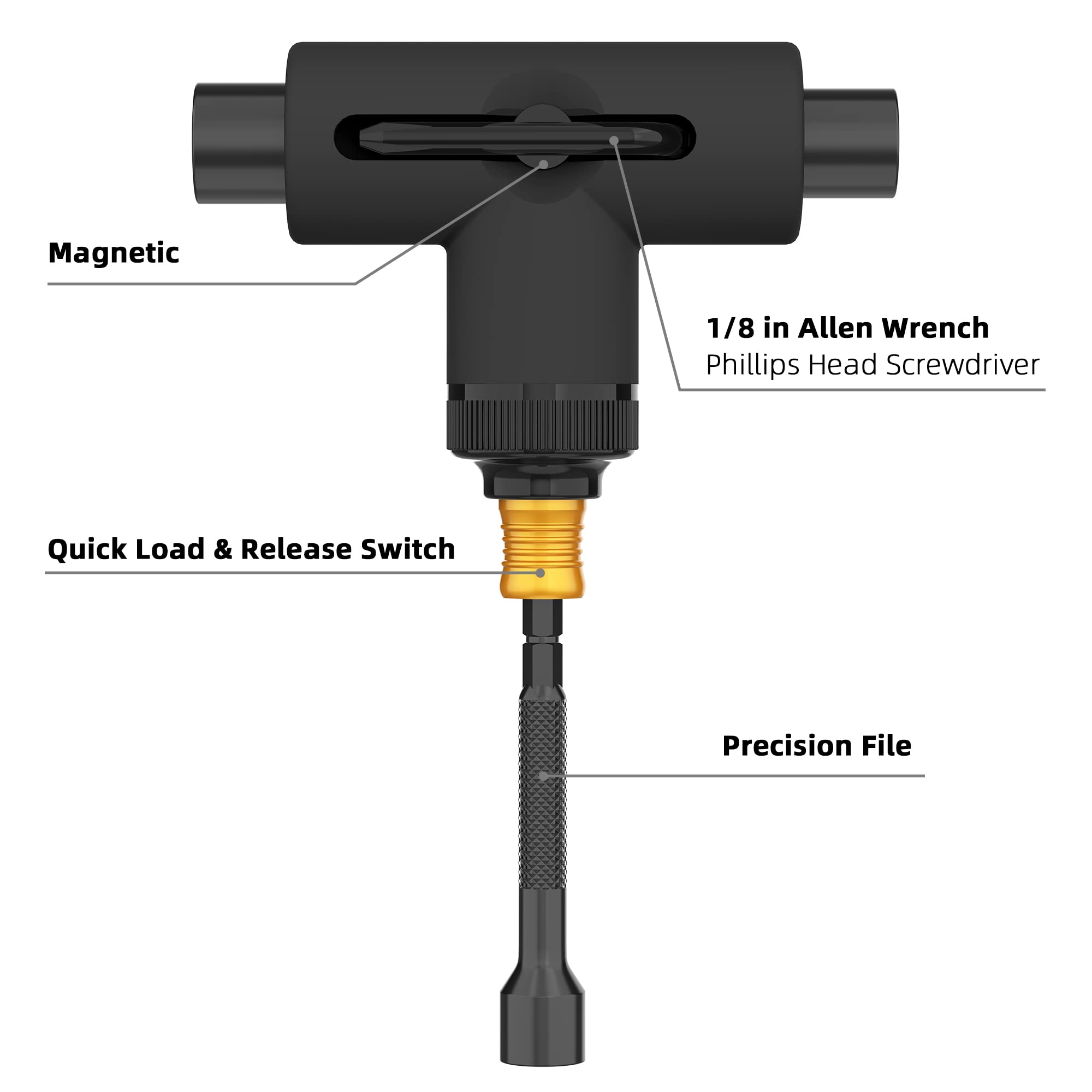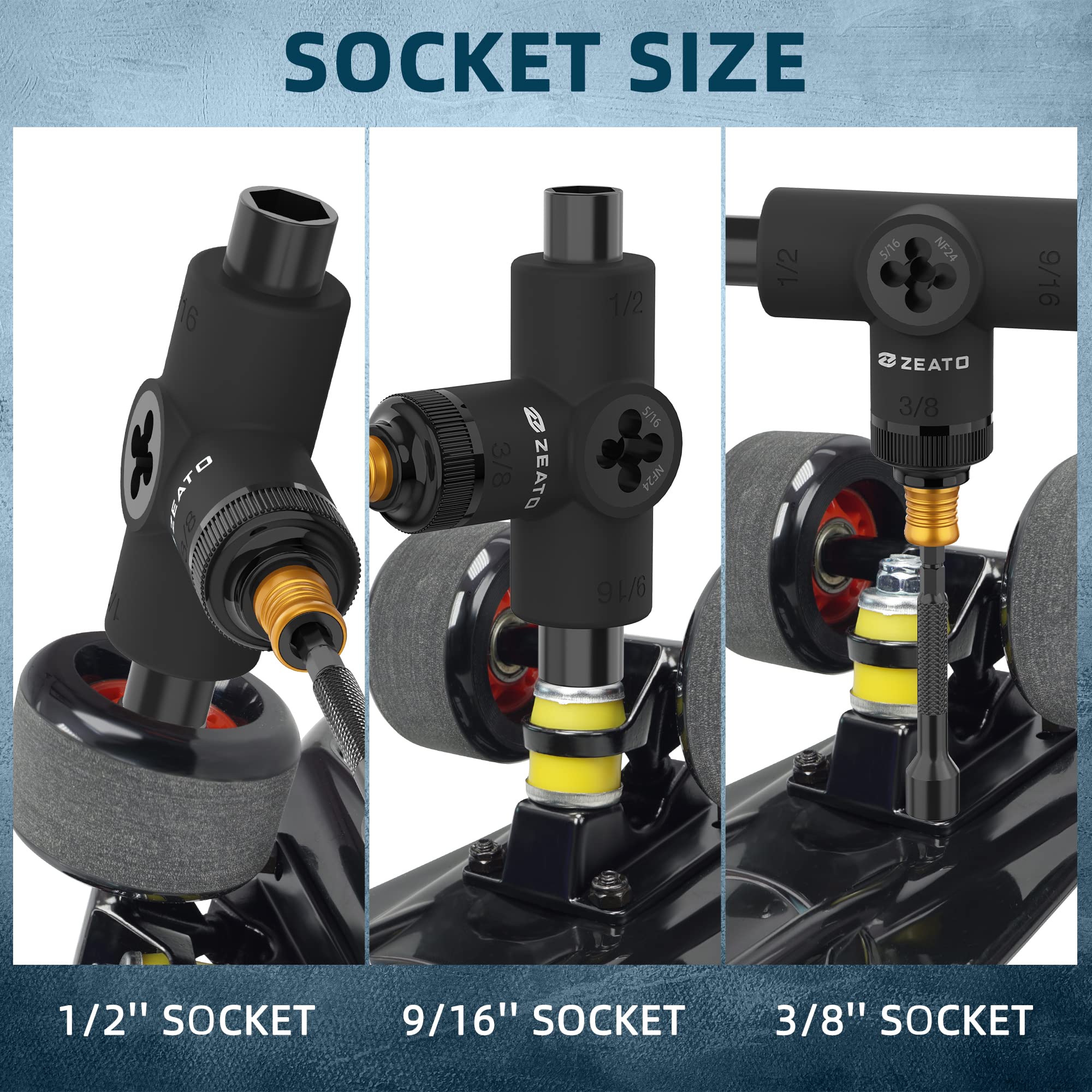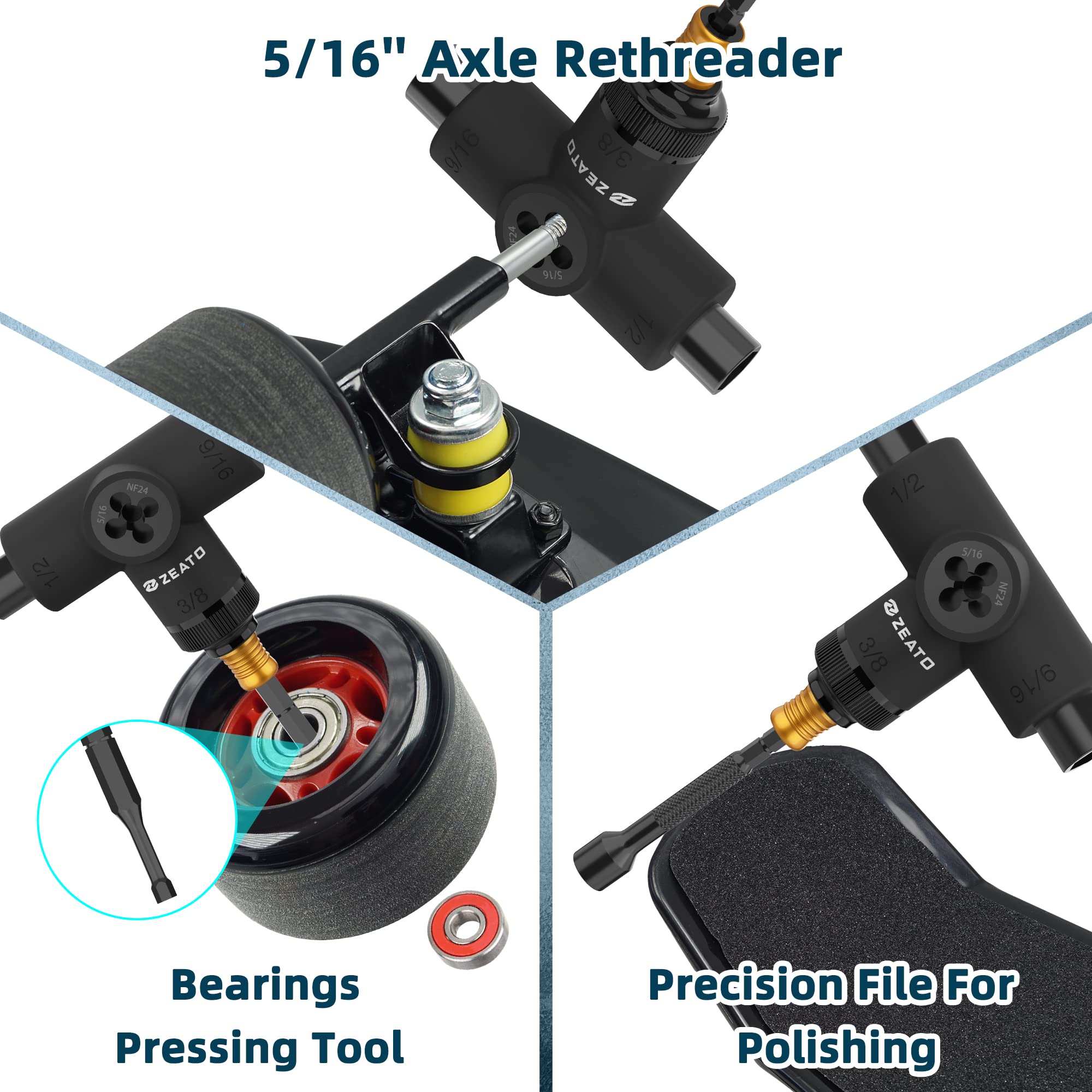 [All-in-One Design]: The skateboard tool includes 3 different of size sockets (1/2'', 3/8'' & 9/16''); A Bearing Press Tool; A Detachable Allen Key (4mm & 5mm); A 1/8 inch Allen Wrench; A Phillips Head Screwdriver; A Precision File and an Axle Rethreader