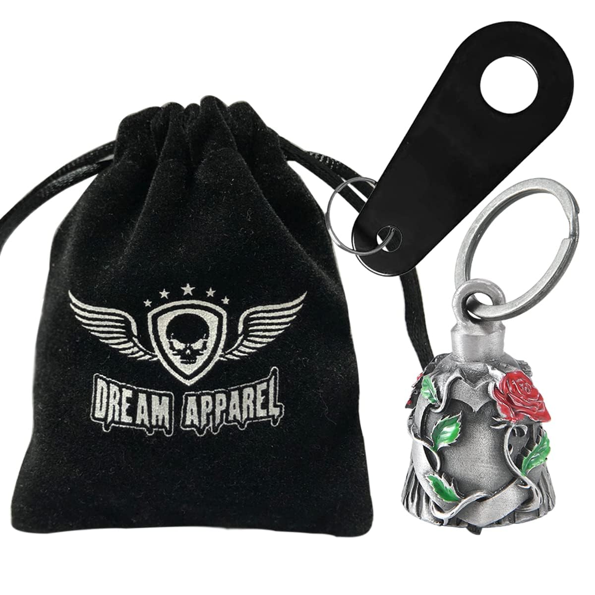 [Dimensions and Package Content] - Measurement of bell: 1.77" Height x 1.18" Diameter. Weight: 0.18 LBS. Each bell comes with a 1.18" split key ring, a drawstring black velvet bag, a black bell hanger and a motorcycle bell legend card. Motorcycle bell is easy to install with bell hanger or zip tie.