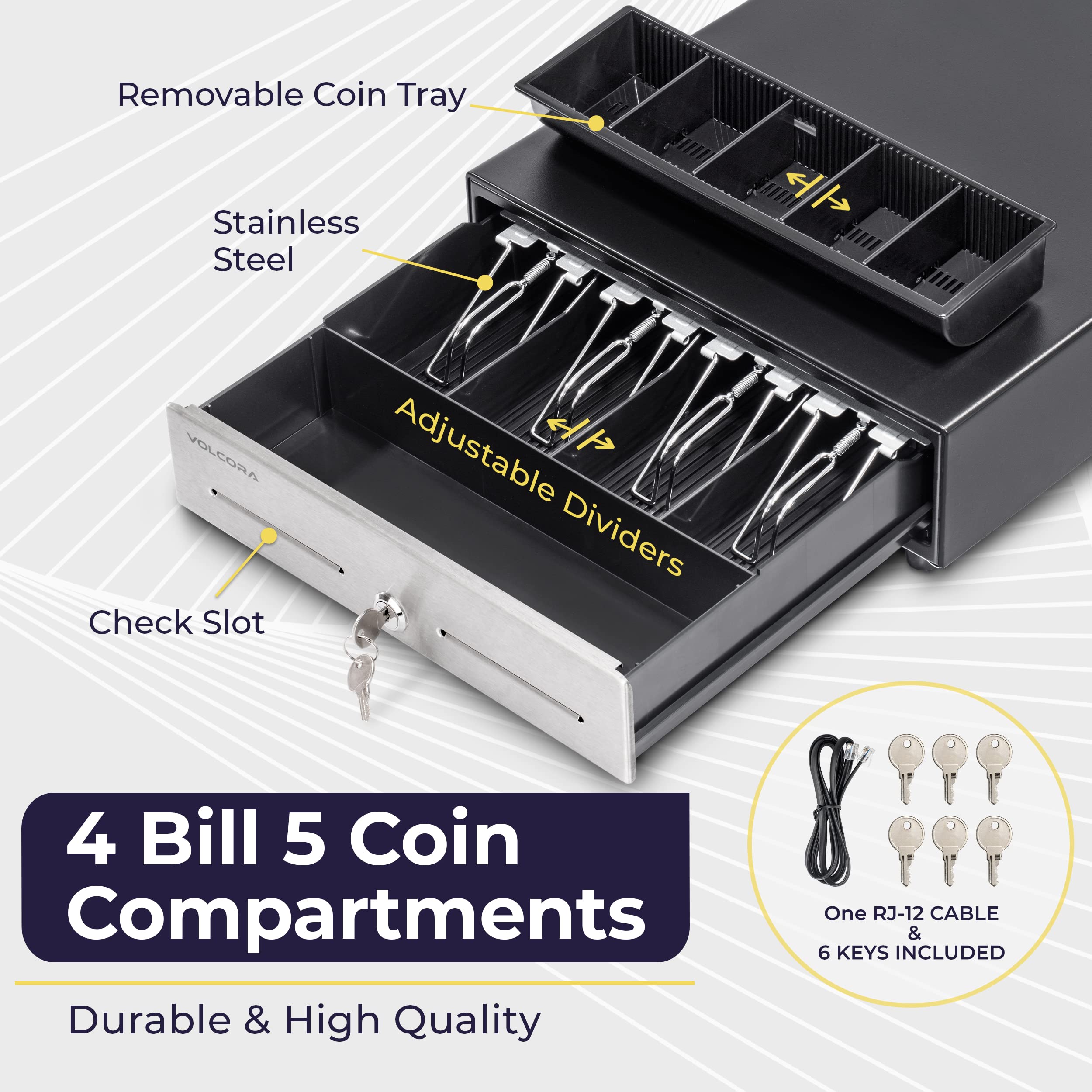 4 BILL / 5 COIN SLOTS: Our small cash register has a built in cash tray that comes with a removable coin tray to maximize the partitions to 4 bill slots and 5 coin slots. The stainless steel front panel has 1 media compartment for large bills, checks, and receipts storage without opening the drawer.