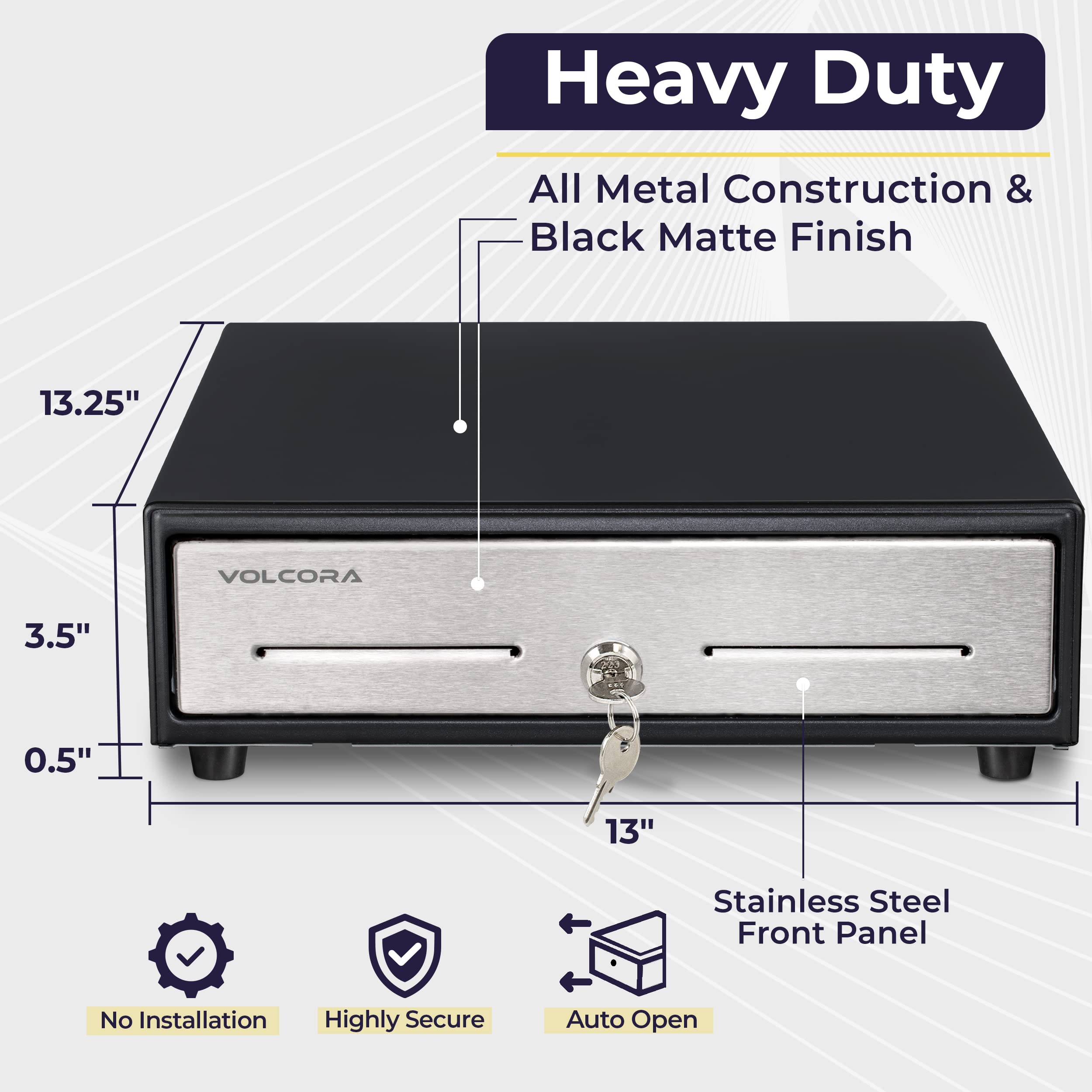 DURABLE AND GREAT LOOKING DESIGN - The 13.25" x 13" x 4'' dimensions of this cash register for small businesses is your perfect choice. Built out of heavy gauge metal steel, these cash registers will last through years. Volcora’s cashier register also boasts a unique color combination of black and stainless steel front.